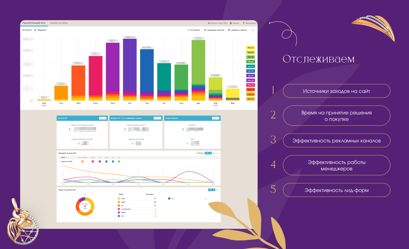 Благодаря системе сквозной аналитики проводим оптимизацию рекламных кампаний, отслеживаем эффективность гипотез по продвижению и взаимодействию с целевой аудиторией.