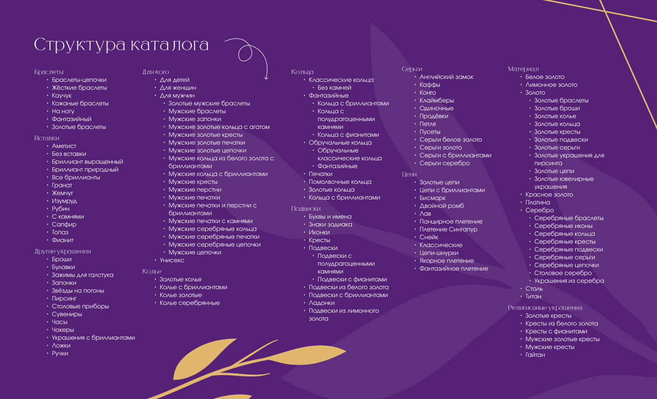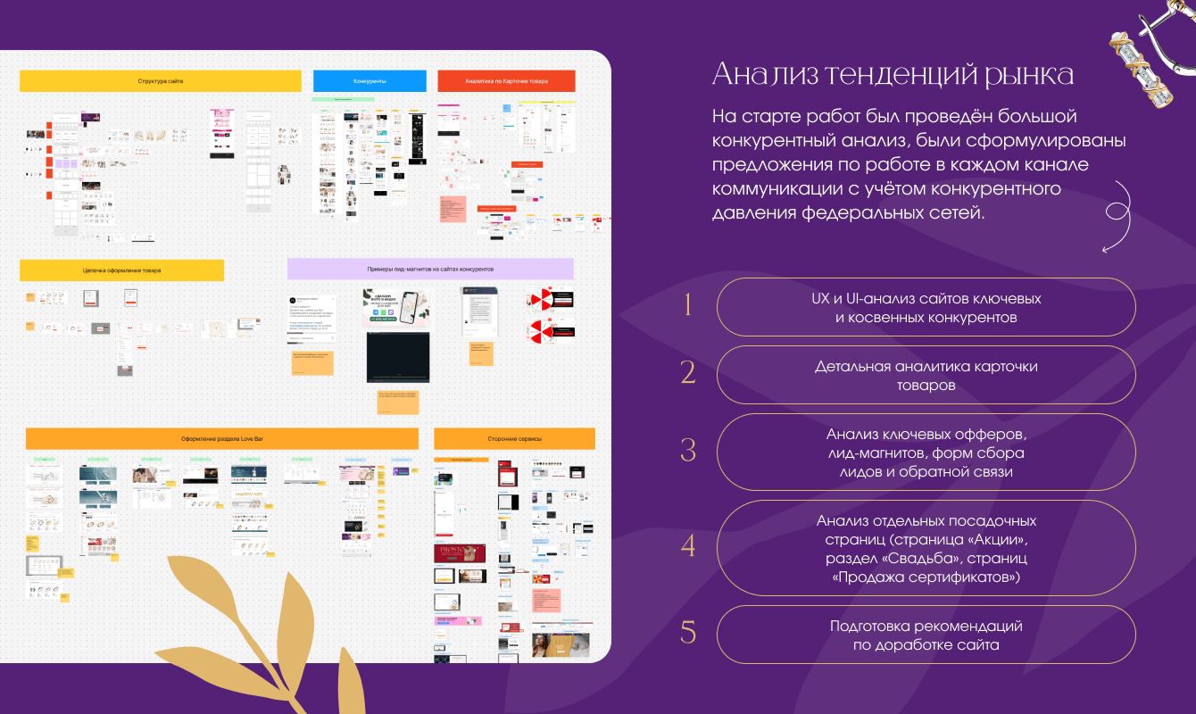 Провели аудит действующих каналов ювелирной сети: представленность и заполнение профиля в Яндекс Бизнесе, агрегаторах первой страницы поисковой выдачи, созданных страниц Вконтакте, канала в Telegram, UX/UI - анализ сайта Заказчика.