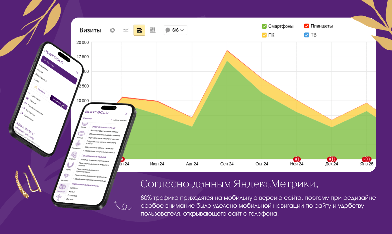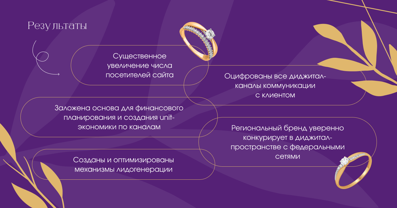 Есть мнение, что региональные ювелирные компании не могут успешно конкурировать в диджитал с федеральными сетями. Так что наш интерес к работе подогревало еще и желание опровергнуть это утверждение. Считаем, что нам это удалось. Работа была интересной, тк требовала серьезной экспертизы во всех областях: от модернизации сайта и Seo до управления каналами платной рекламы и сквозной аналитики. Уверена, что мы заложили прочный фундамент для дальнейшего развития проекта. И отдельное спасибо команде на стороне Заказчика - такой объем работ было бы невозможно выполнить без их активного участия и вовлеченности!