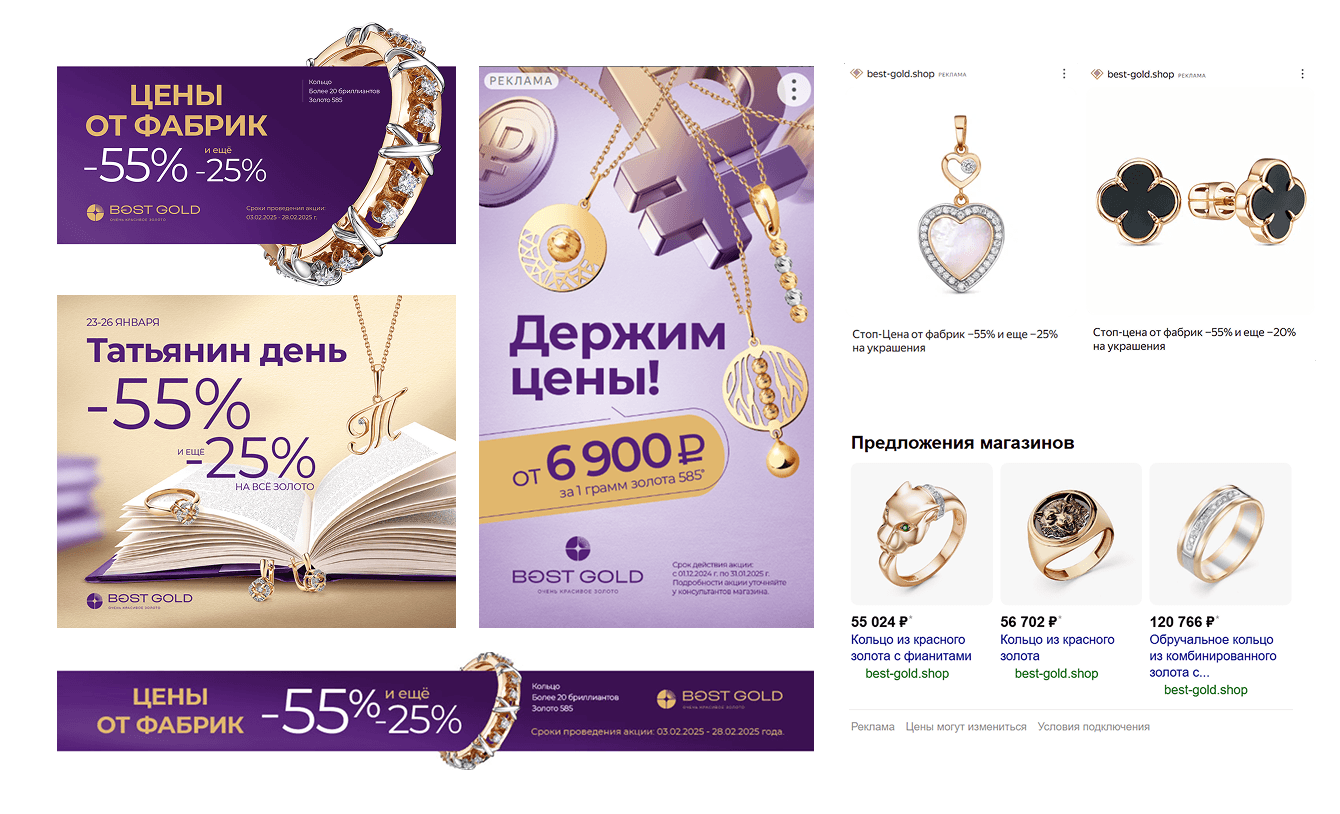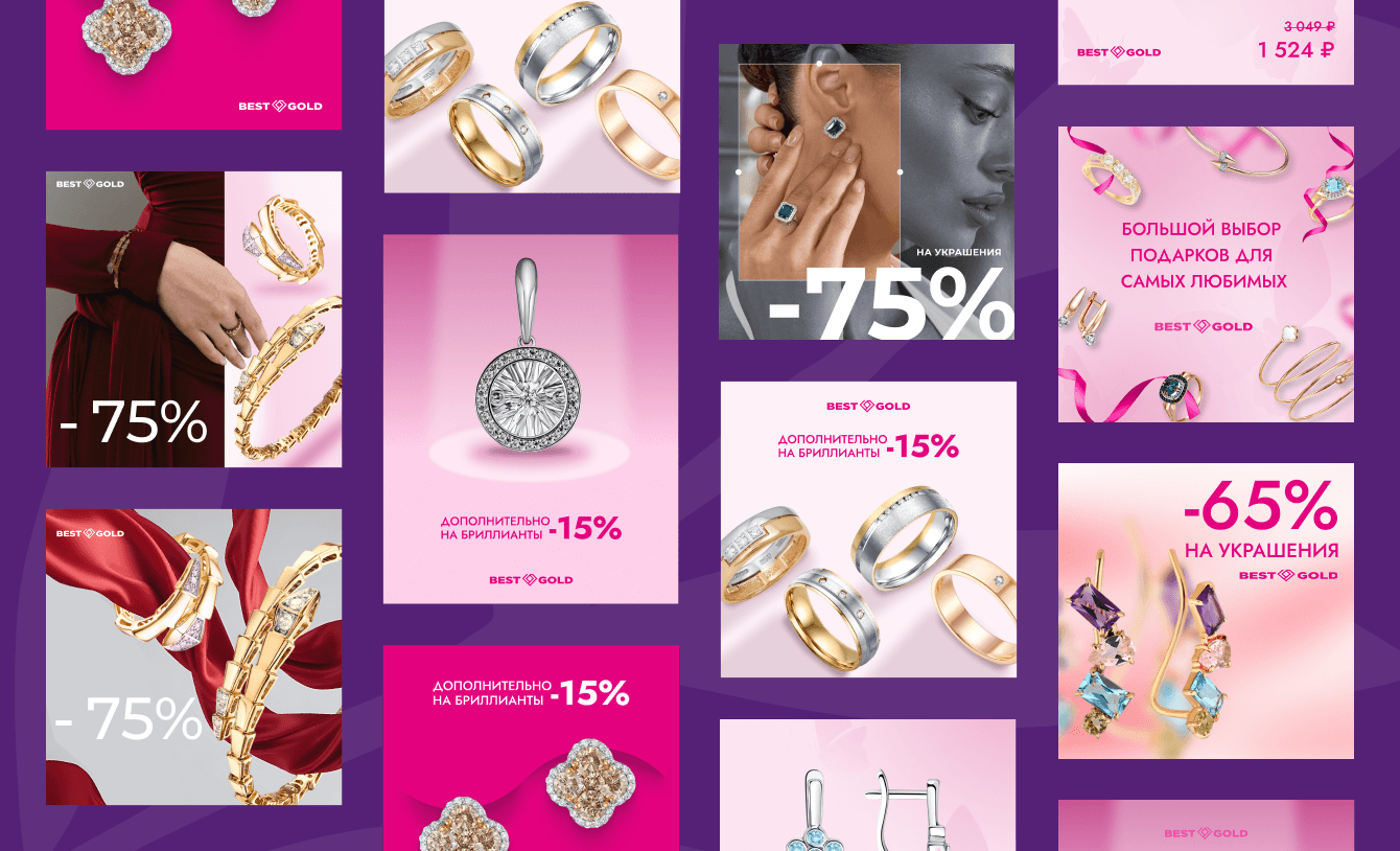 В креативах сосредоточились на баннерах с информацией о скидках и выгодных предложениях с демонстрацией трендовых украшений. Для разных аудиторий готовили разные креативы, подходящие под их интересы.