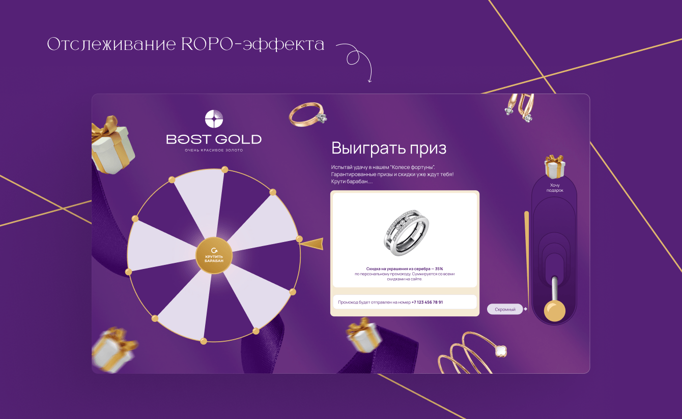 Для усиления отслеживания ROPO-эффекта Заказчику была предложена акция с оффлайн-розыгрышем подарков в магазинах сети. Суть акции в том, что покупатель имеет возможность в салоне на специальном планшете оставить свой номер телефона и, раскрутив колесо фортуны, выиграть приз: подарок или скидку. Эта акция выступает и инструментом повышения конверсии посетителей в покупателей, и способом дополнительной оцифровки покупателей, когда мы можем отследить каналы взаимодействия пользователя с сайтом до того, как он оставил свой номер телефона в магазине.