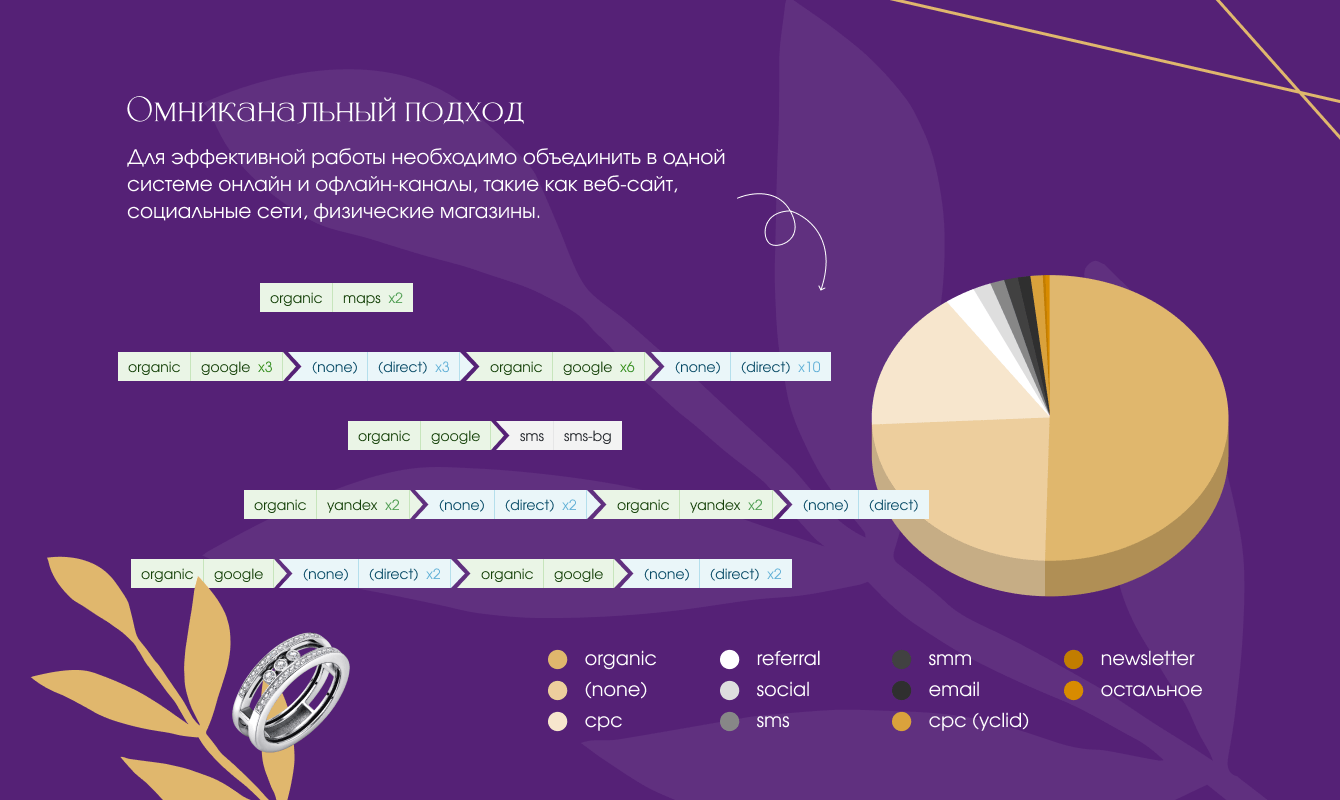Было принято решение работать по продвижению ювелирной сети комплексно. Начали с представления пути клиента: когда, в какой ситуации потенциальный клиент задумывается о приобретении ювелирных украшений, какие шаги совершает, прежде чем прийти в магазин/на сайт и сделать покупку.