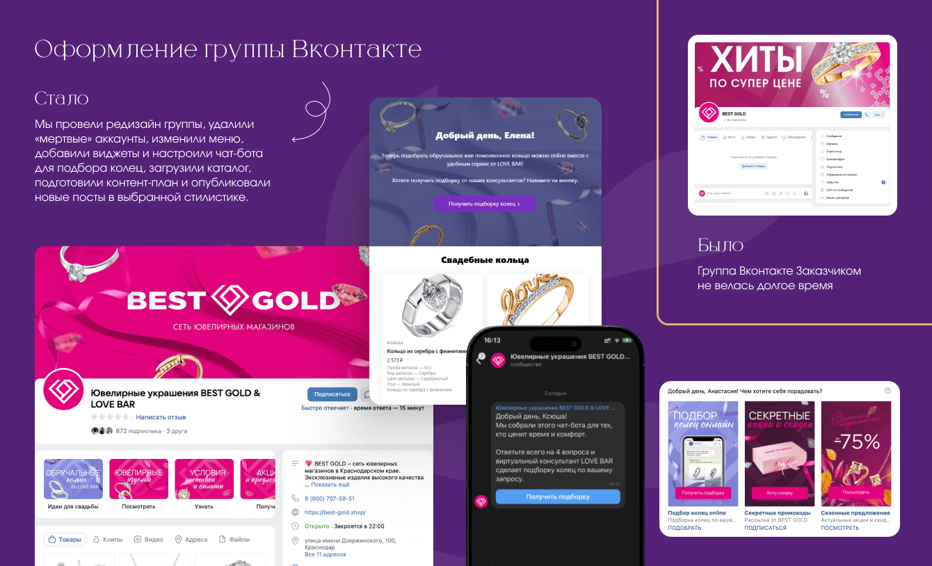 Группа Вконтакте Заказчиком не велась долгое время, поэтому мы провели редизайн группы, удалили «мертвые» аккаунты, изменили меню, добавили виджеты и настроили чат-бота для подбора колец, загрузили каталог, подготовили контент-план и опубликовали новые посты в выбранной стилистике.