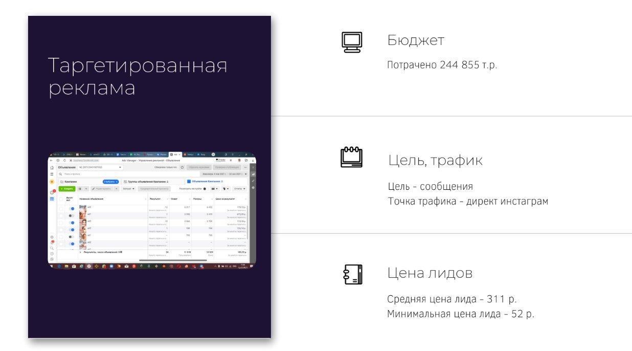 Клиент: студия косметологии поставили задачу в течение месяца создать и полностью упаковать аккаунт, запустить таргетированную рекламу, как следствие привлечь клиентов и поднять доход студии.