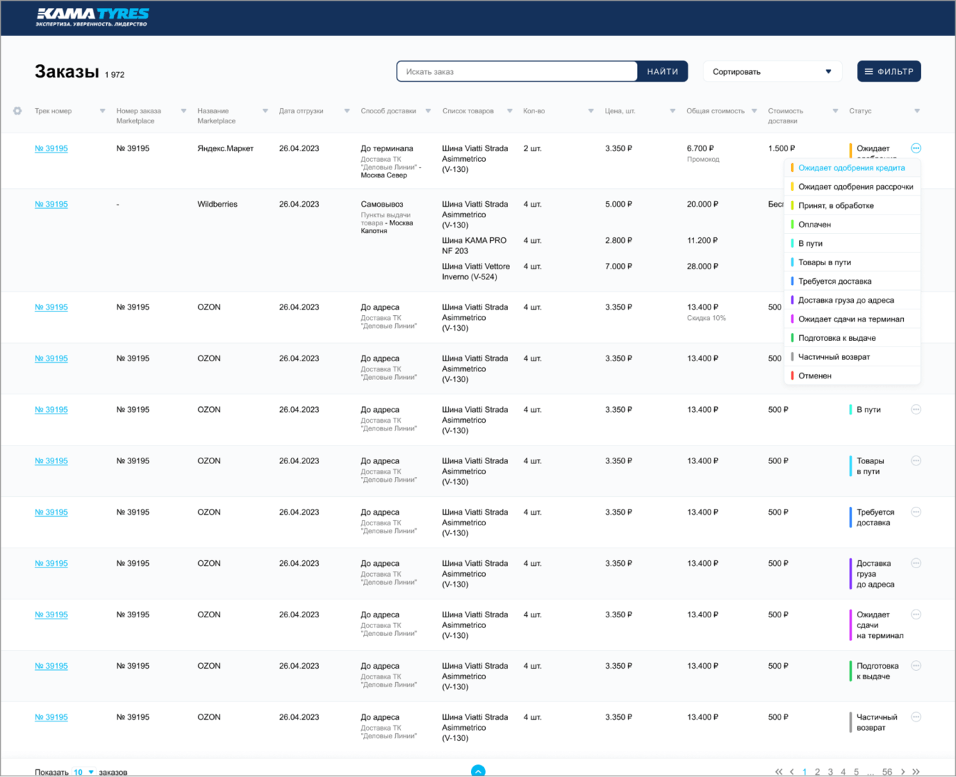 1. Фильтр по заказам: фильтр по дате, номеру заказа (в т.ч. с маркетплейса), службе доставки.