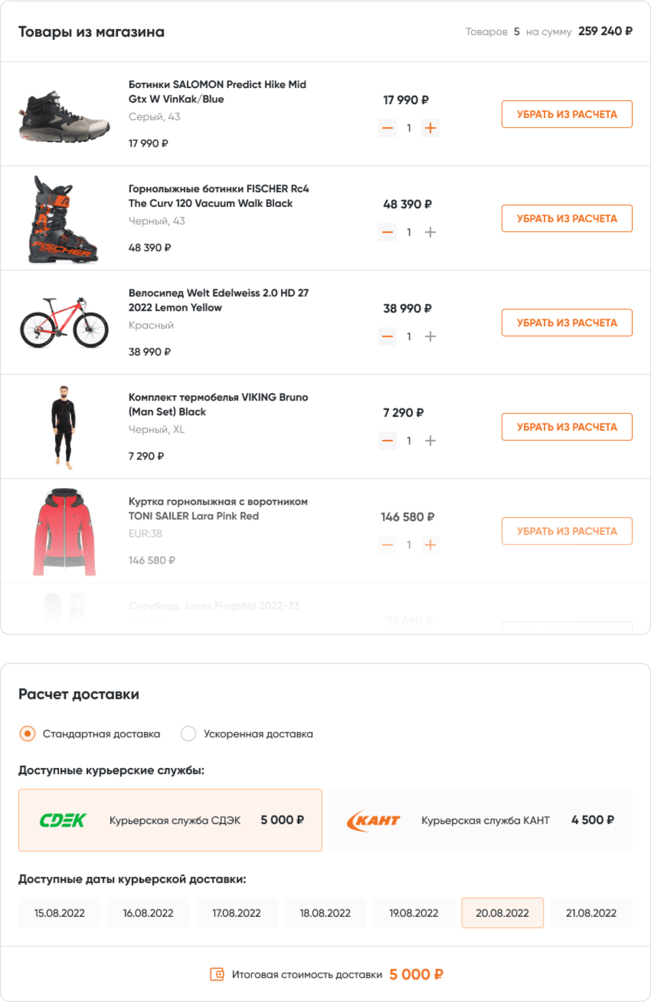 Спортивные товары могут быть габаритными и тяжелыми, поэтому нужно было предусмотреть возможность оформить доставку не только из интернет-магазина, но и на кассах офлайн-магазинов.