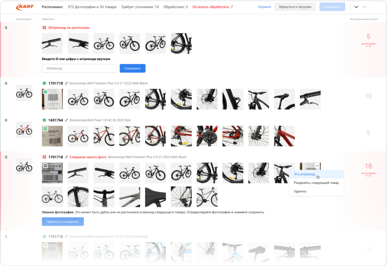 -обработать возникшие ошибки, при необходимости внести изменения в ручном режиме (например, ввести штрих-код вручную, если программа не смогла его распознать, поменять сортировку фотографий и так далее);