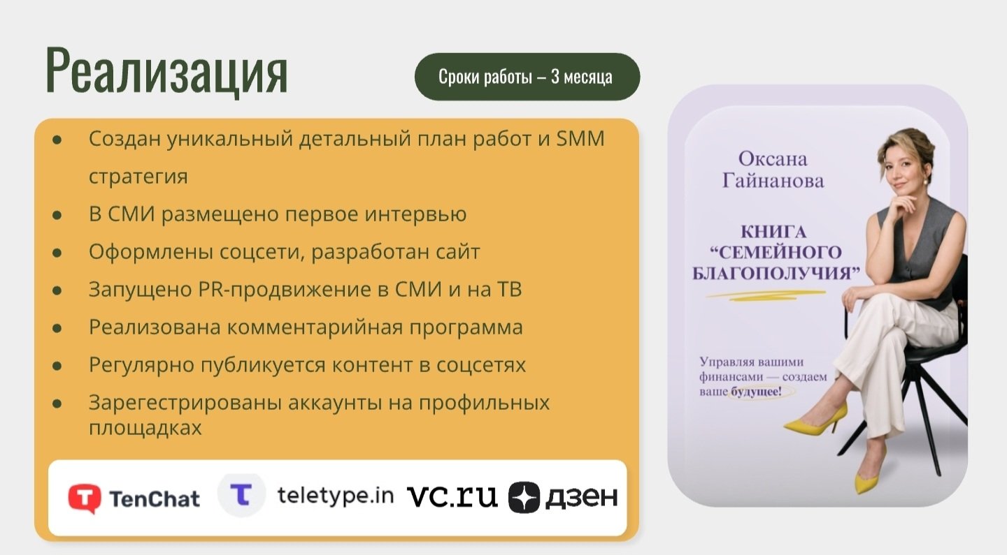 Кейс Оксаны Гайнановой наглядно демонстрирует, что в сфере финансовой грамотности успешный личный бренд строится на синхронизации глубокой экспертизы, продуманной цифровой презентации и, что критически важно, активного присутствия в авторитетных СМИ и на телевидении. Это трансформирует личный опыт в узнаваемый, доверительный и коммерчески эффективный актив, который работает на эксперта 24/7, привлекает идеальных клиентов и создает условия для роста.