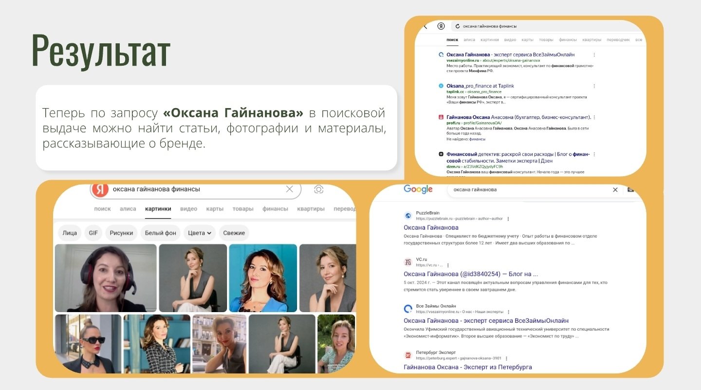 · Цифровой след как неоспоримое доказательство экспертизы: по запросу «Оксана Гайнанова» в поисковой выдаче теперь находится множество статей, интервью, профилей на VC.ru, в сервисе «ВсеЗаймыОнлайн», а также ссылки на личный сайт и соцсети. Это создало полноценный и контролируемый цифровой портрет эксперта.