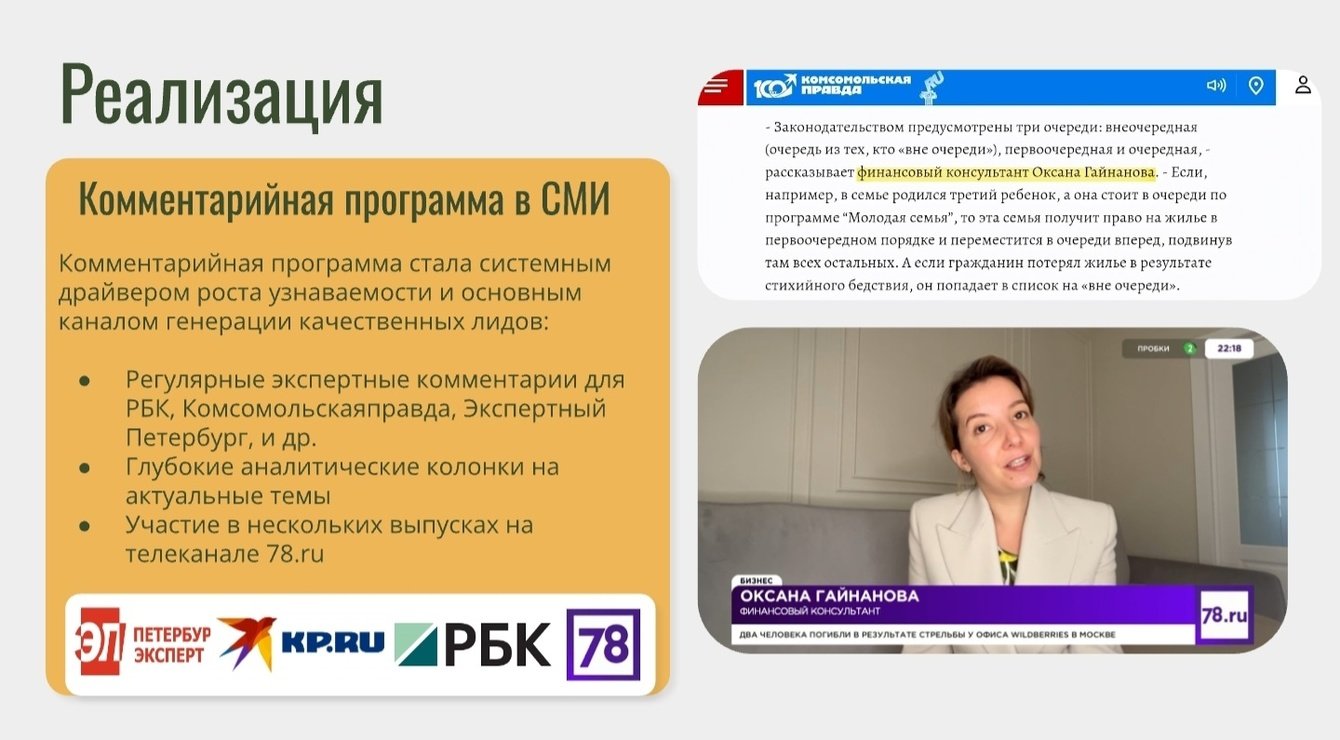 · Стратегический выход на телевидение: реализовано целенаправленное продвижение на телевизионные площадки. Ключевым результатом стало участие в нескольких выпусках на телеканале 78.ru. Экспертные комментарии на ТВ, например, по острым социально-финансовым темам (очередь на жилье, программы поддержки), стали мощнейшим социальным доказательством, закрепившим в сознании аудитории статус Оксаны как главного практикующего эксперта, к которому обращаются СМИ за комментариями федерального уровня.