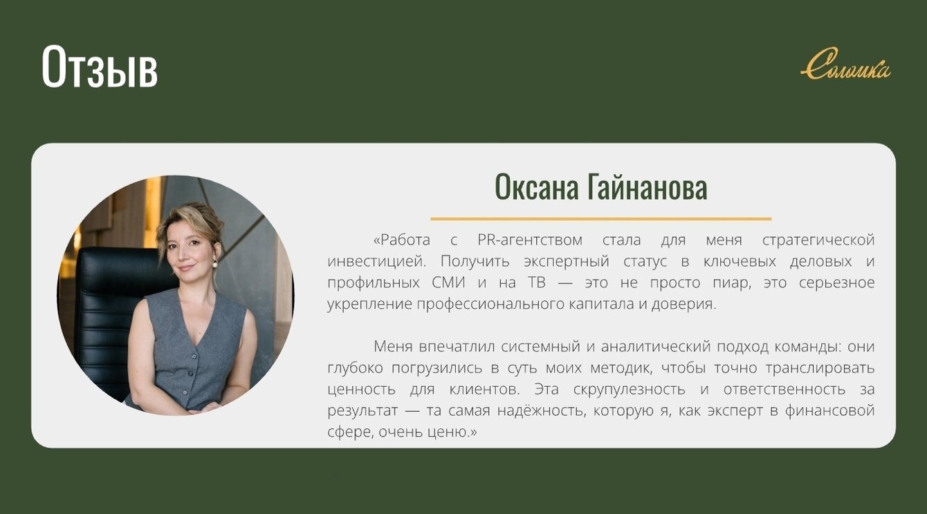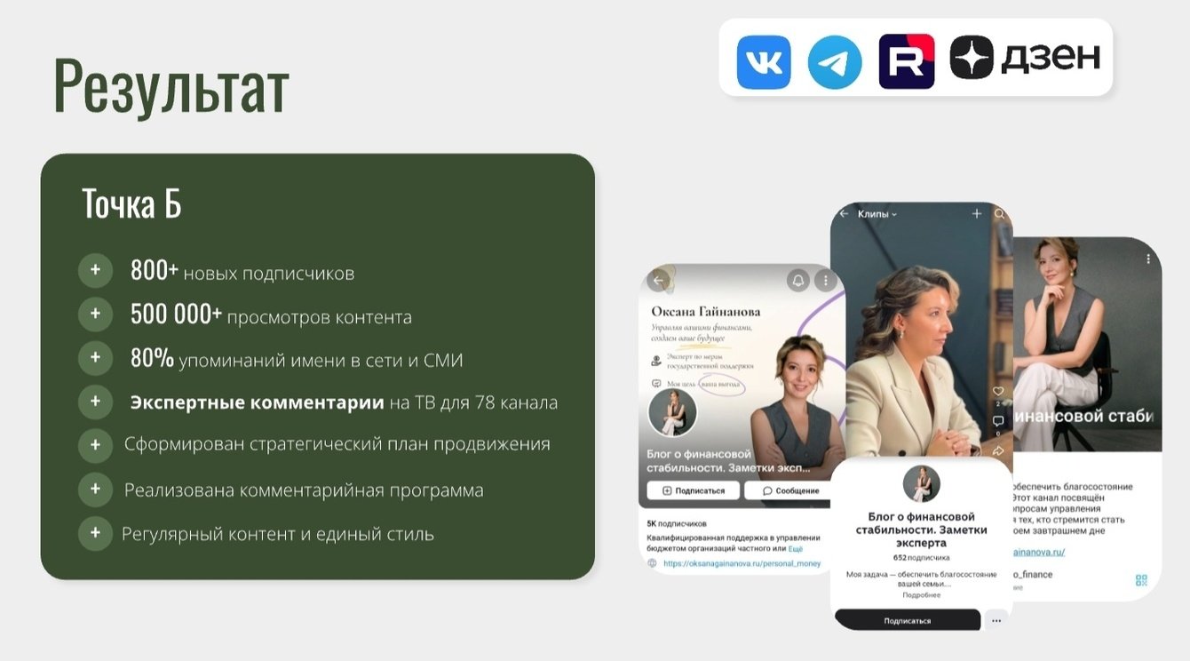 4. PR-продвижение — это инвестиция в профессиональный капитал. Как отметила сама Оксана, работа с агентством стала для нее «стратегической инвестицией», которая укрепила не просто известность, а профессиональный капитал и доверие, что является ключевым активом для эксперта в чувствительной финансовой сфере.
