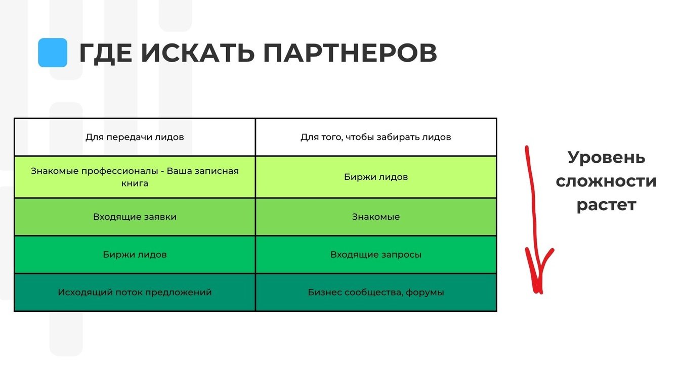 Но есть и другие случаи. Бывает, к вам заглядывает клиент с огромными запросами или запросами не по Вашему профилю. Он будет рад, если вы сможете направить его к надежным партнерам, которые точно умеют решать такие задачи и имею кейсы. И здесь вы так же заработаете на заключенной сделке, если у вас есть договоренность с такими компаниями.
