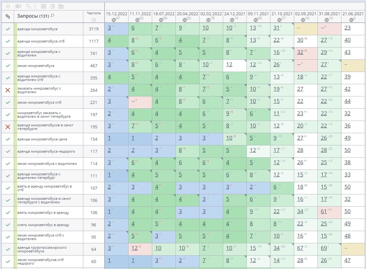 Сбор высокочастотных и среднечастотных запросов по теме аренды автобусов и микроавтобусов (аренда с водителем, на свадьбы, перевозка пассажиров, трансферы и т.д.), оптимизация страниц сайта под запросы для их выведения в ТОП-10 выдачи поисковых систем.
