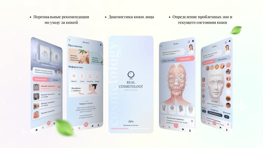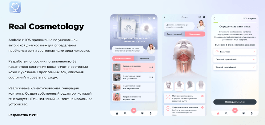 Перед нами стояла задача собрать в одном мобильном приложении огромные алгоритмы диагностики состояния лица человека, чтобы рекомендовать косметологические процедуры индивидуально для каждого пользователя. Запатентованная система диагностики позволяет дать характеристику по 38 косметологическим признакам.
