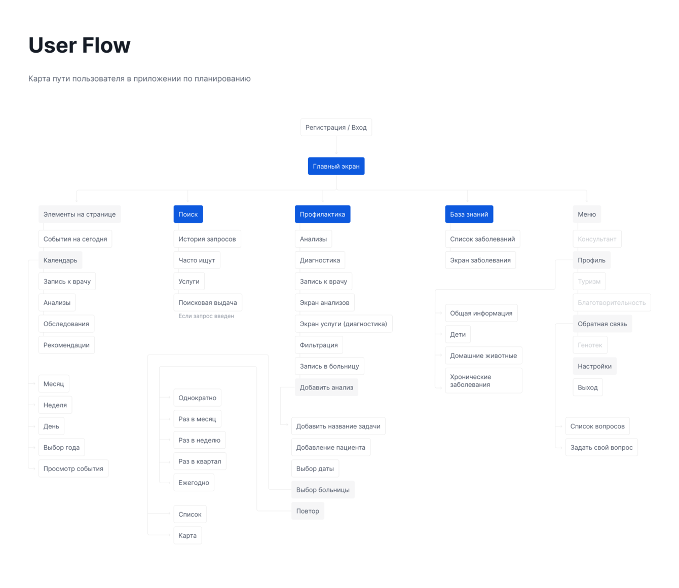 Реализовали технологично-понятный User Flow в современном дизайне: приложение подсказывает пользователям, когда следует посетить нужного врача, запланировать сеанс в поликлинику или пройти комплексное обследование.