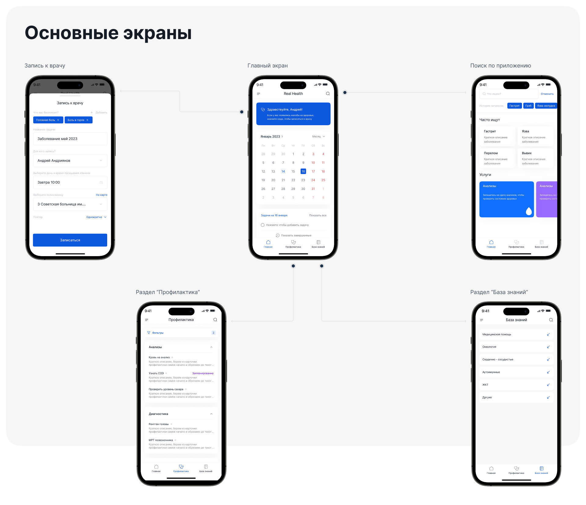 С этим пониманием мы создаём каркас интерфейса Real Health, основная задача которого — помогать пользователям заботиться о себе.
