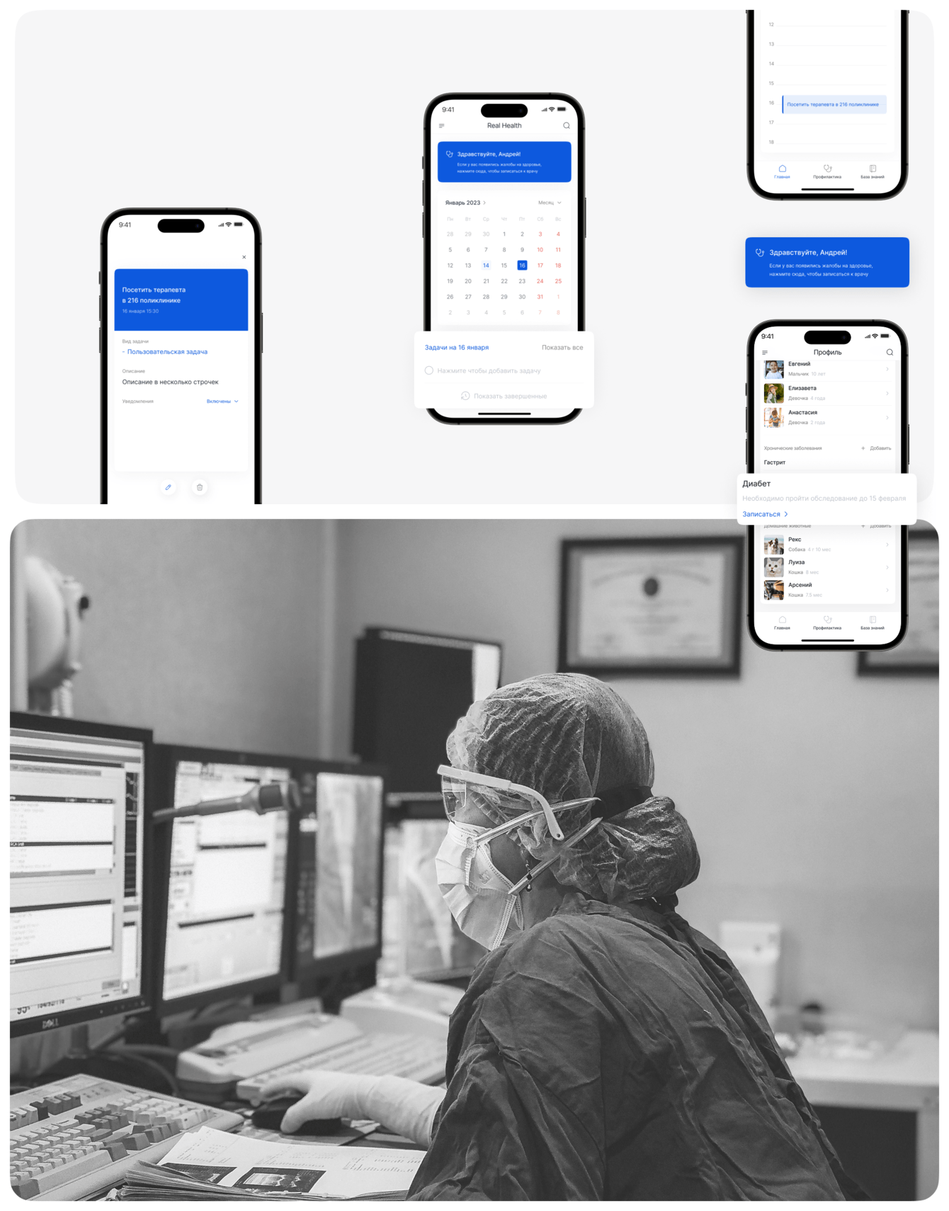 Реализовали технологично-понятный User Flow в современном дизайне: приложение подсказывает пользователям, когда следует посетить нужного врача, запланировать сеанс в поликлинику или пройти комплексное обследование.