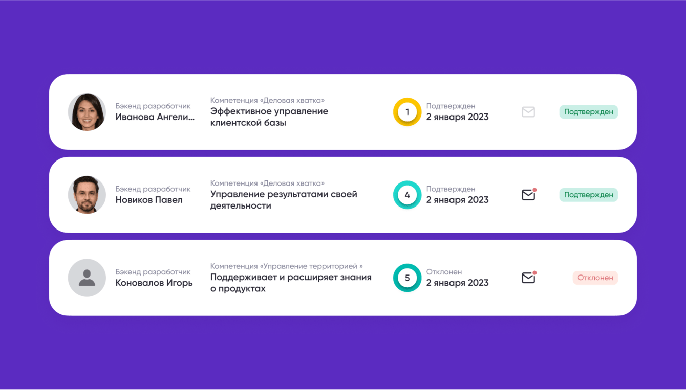 Здесь руководитель видит все заявки от сотрудников своего отдела для подтверждения уровня владения навыком.
