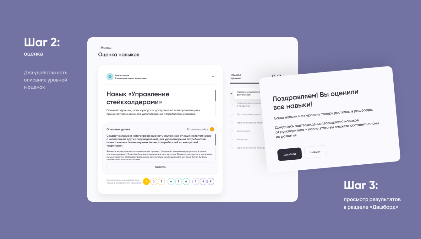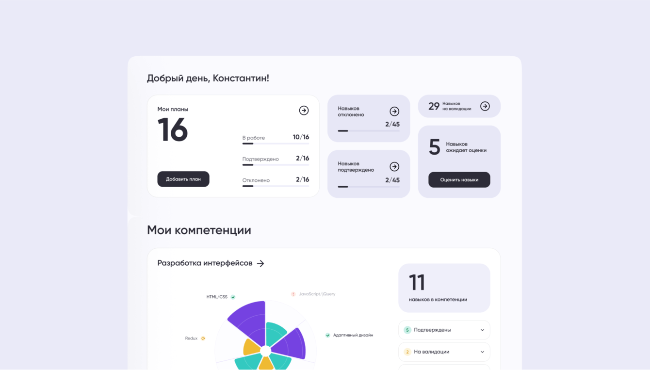 Данные, полученные после оценки, стимулируют сотрудника к рефлексии над своими компетенциями и взаимодействию с руководителем для выстраивания плана развития. Он содержит 3 раздела: дашборд, навыки и профиль.