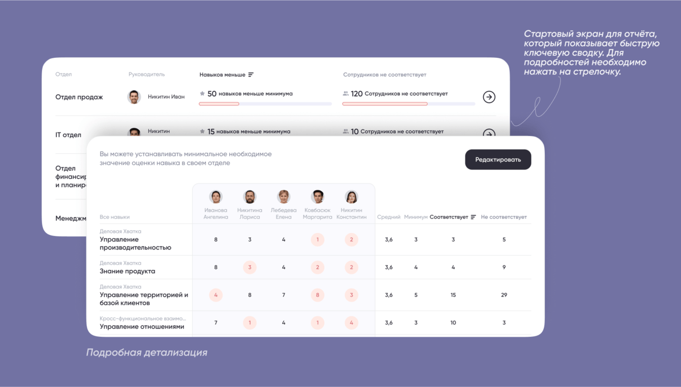 Помогает руководителю понять, соответствуют ли компетенции сотрудников минимальным навыкам внутри отдела, а также выстроить стратегию по развитию экспертизы команды.