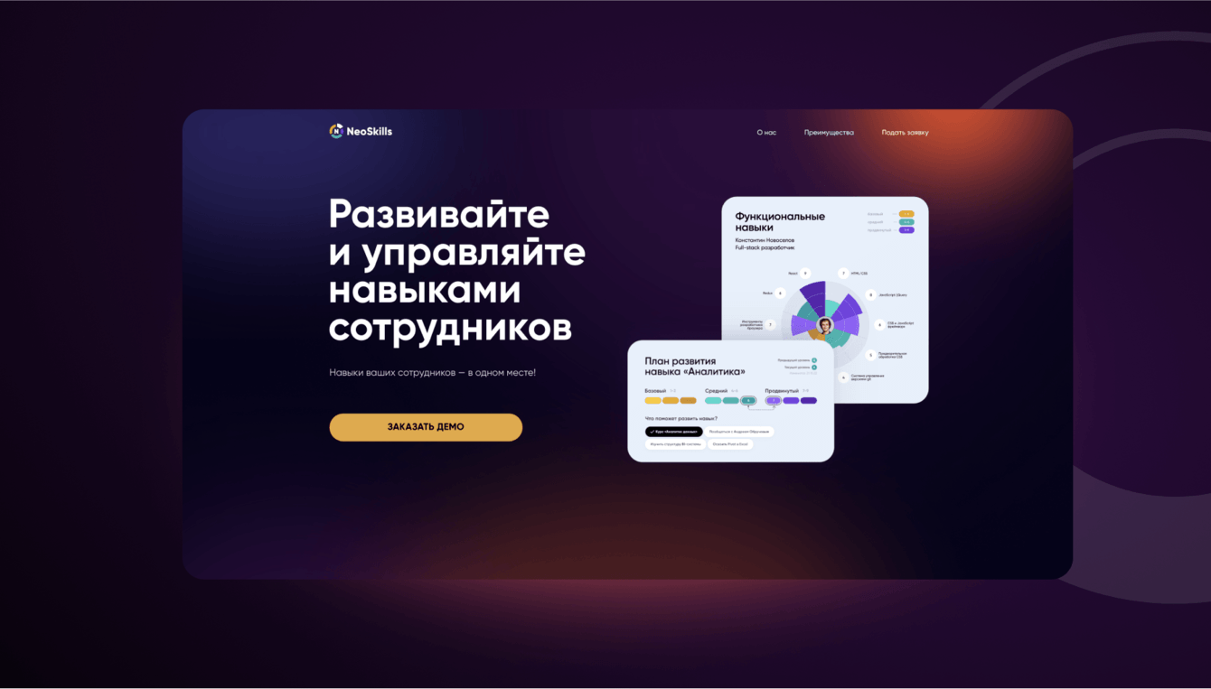 Страница для знакомства с возможностями NeoSkills и привлечения потенциальных клиентов с возможностью оставить заявку и получить демо-версию для тестирования.