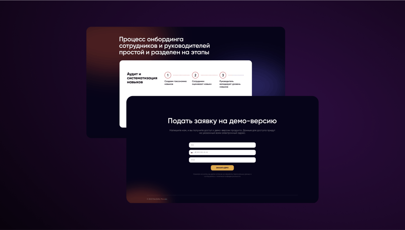 Страница для знакомства с возможностями NeoSkills и привлечения потенциальных клиентов с возможностью оставить заявку и получить демо-версию для тестирования.
