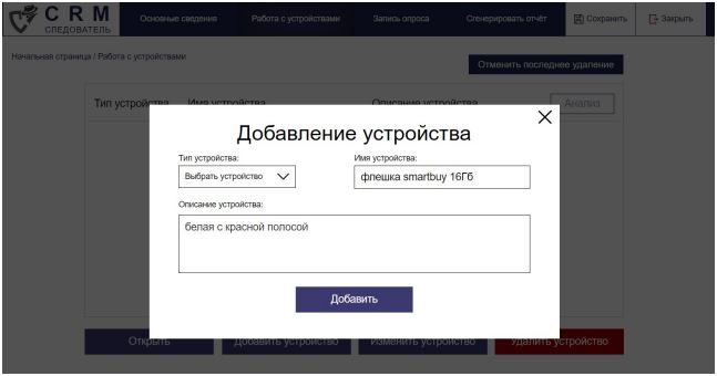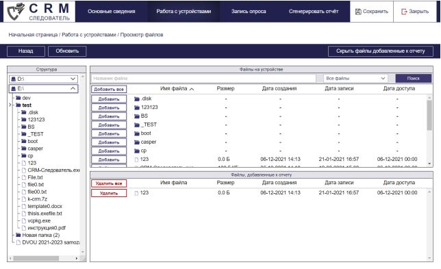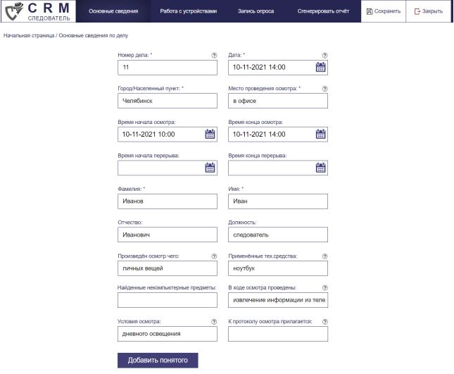 CRM-следователь - приложение для автоматизации работы следователя по составлению протокола следственного действия (в соответствии со статьями 166 и 167 УПК РФ). В данном приложении можно просматривать содержимое устройств (дисков, флешек и т.п.) на предмет наличия файлов определенных типов, можно добавлять и просматривать информацию с мобильных телефонов, можно проводить опросы посредством записи голоса отвечающего через подключенный к компьютеру микрофон, генерировать по входным данным итоговый отчет в заранее определенном формате.