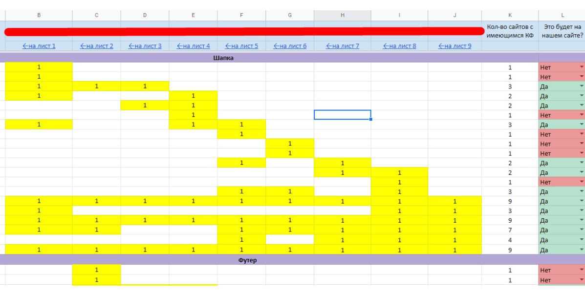 Отобрали 5 лучших конкурентов, имеющих хорошую видимость по семантике и поисковой выдаче. После составили сводную таблицу со всеми элементами, что имелись у них, но отсутствовали у нас.