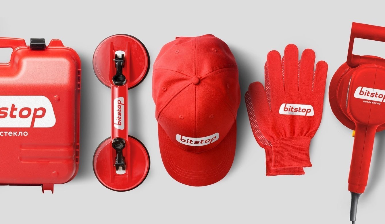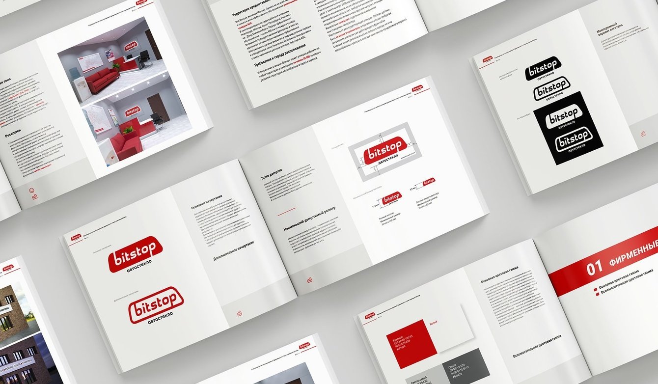 Нами так же были разработаны варианты входной группы станций, вывески, элементы внутреннего интерьера, зона ресепшена, зона ремонта, система навигации и т. д. Результатом работы стал новый объемный брендбук и строящиеся станции «Bitstop»