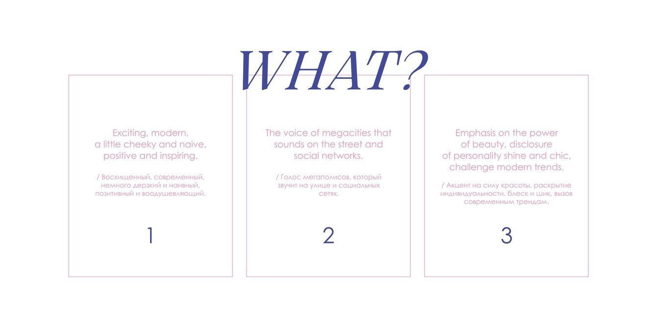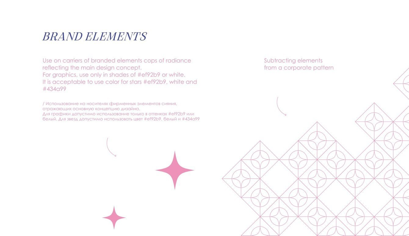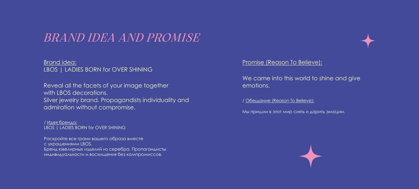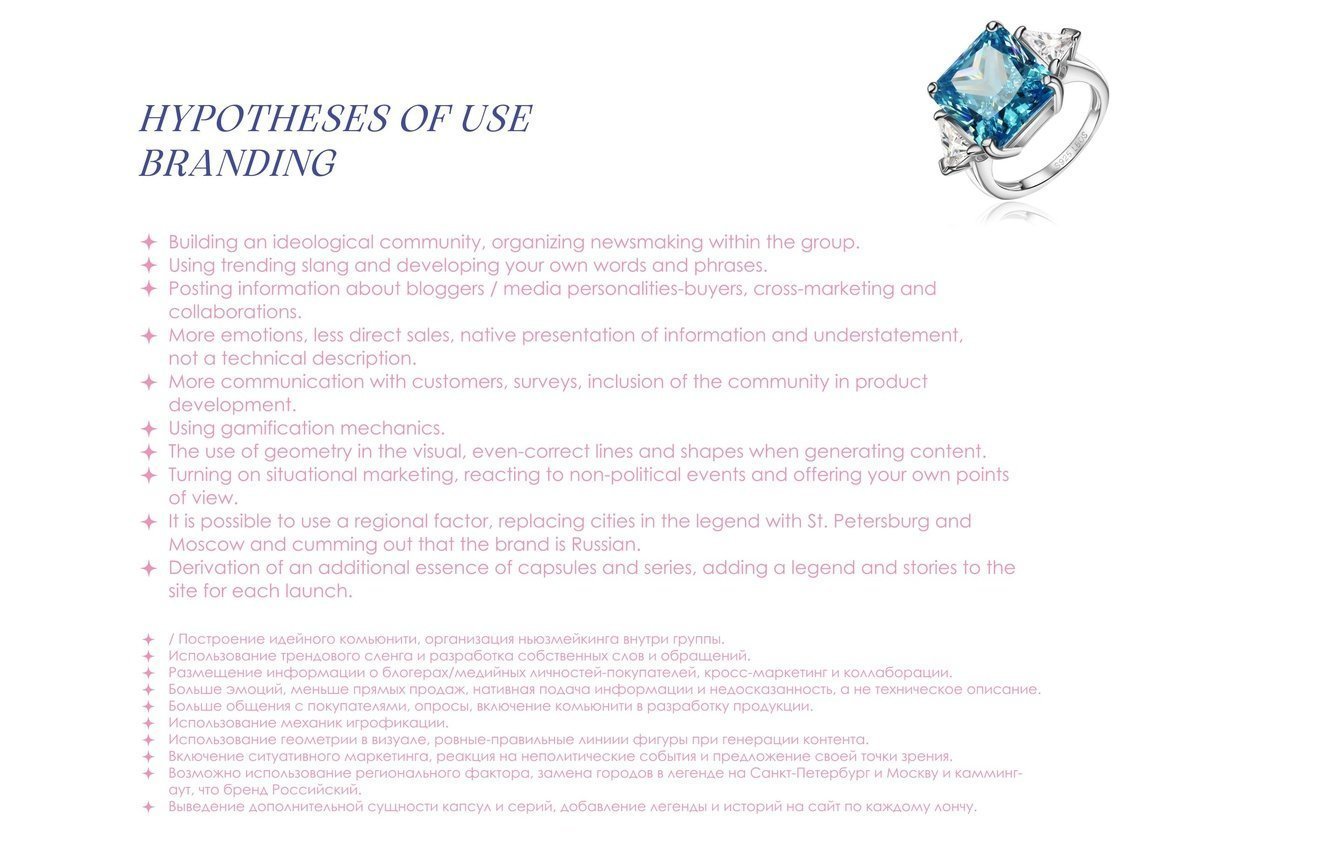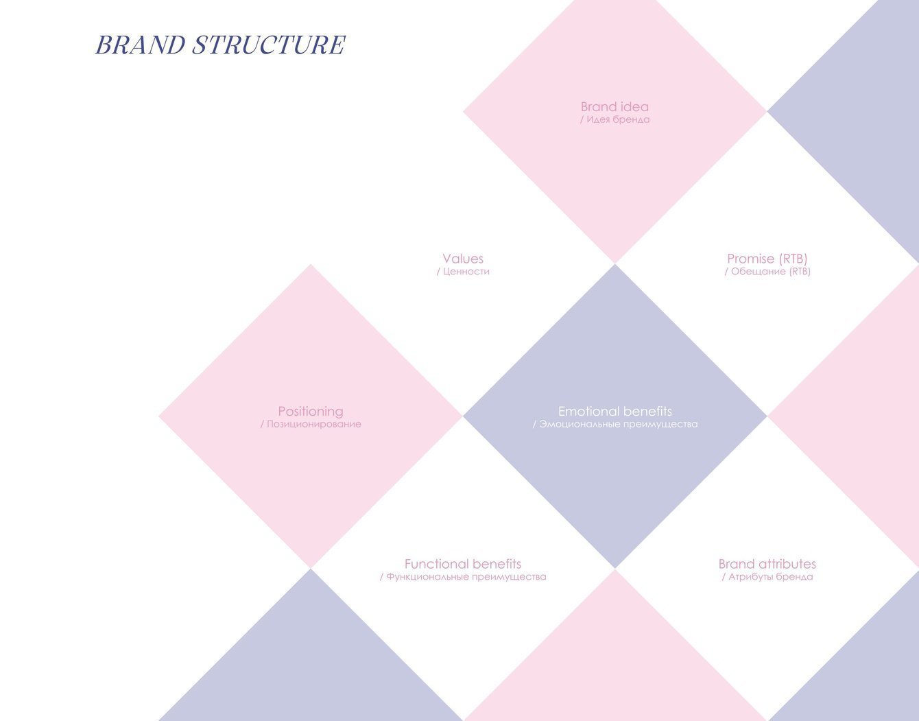 Определение целевой аудитории, анализ конкурентной среды, построение RTB (Reason To Believe) и Big idea (слоган, аббревиатура, легенда, tone of voice, облако бренда, образ, обращение), создание структуры бренда и гипотез использования брендинга, рекомендации по контенту, разработка логотипа, фирменного стиля и упаковки.