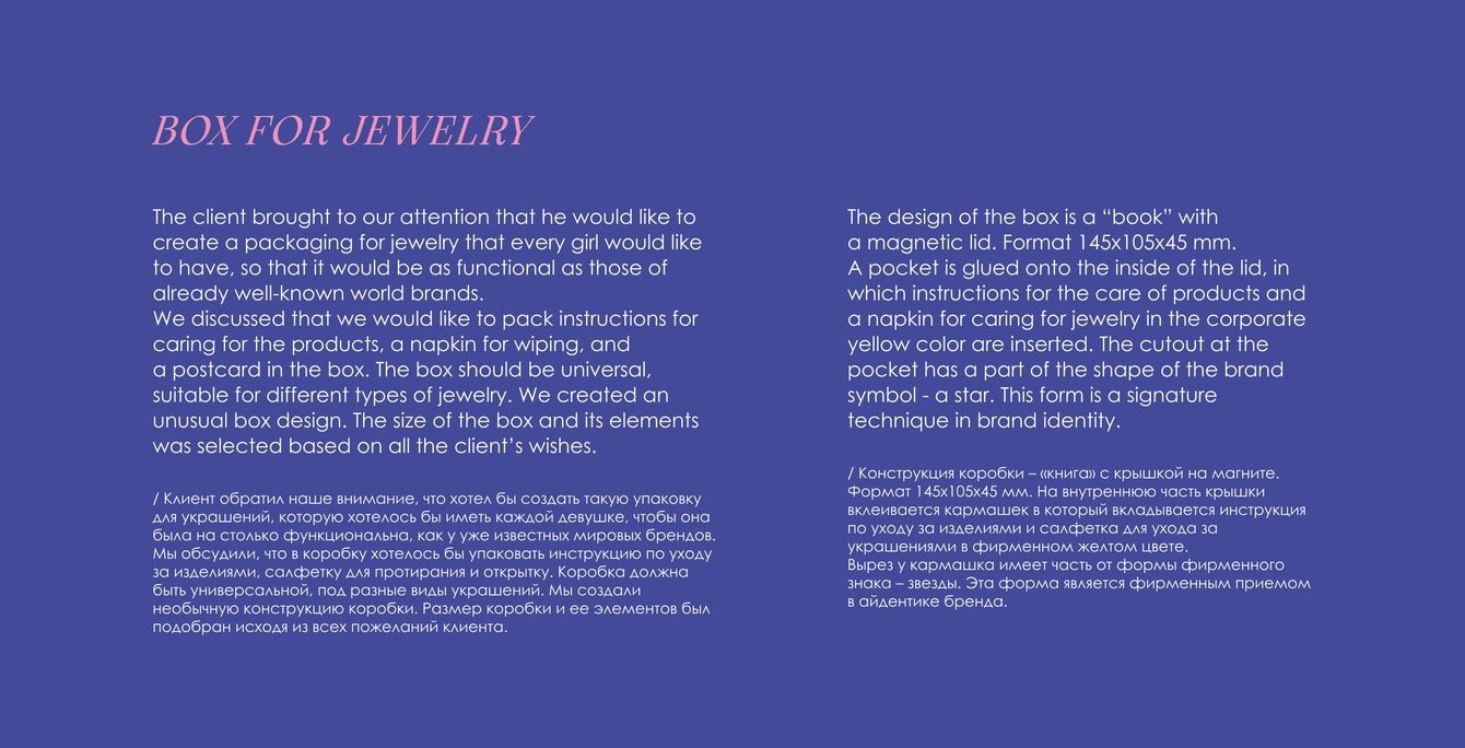 По итогам работы сформирована платформа бренда, позиционирование на рынке. Клиент успешно обновил и внедрил упаковку ювелирной продукции, что положительно повлияло на узнаваемость бренда. Результат: бренд успешно развивается, прибыль от бизнеса кратно растет.