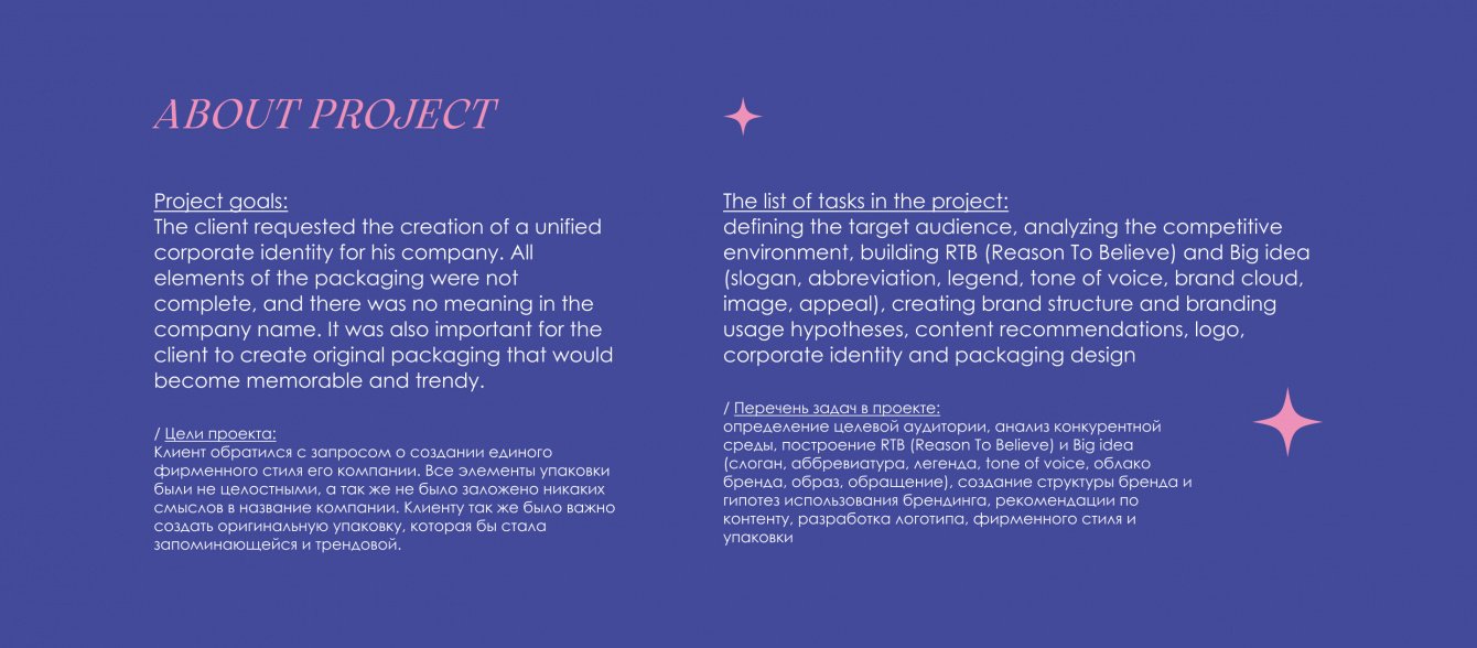 Клиент обратился с запросом о создании единого фирменного стиля его компании. Все элементы упаковки были не целостными, а так же не было заложено никаких смыслов в название компании. Клиенту так же было важно создать оригинальную упаковку, которая бы стала запоминающейся и трендовой.