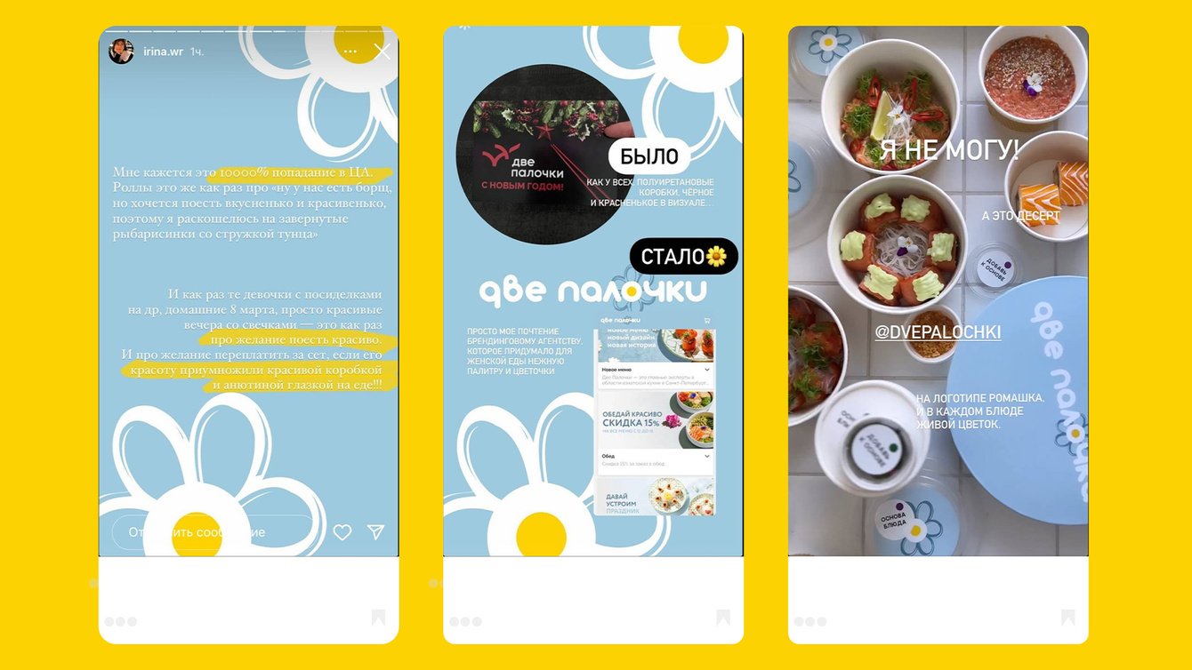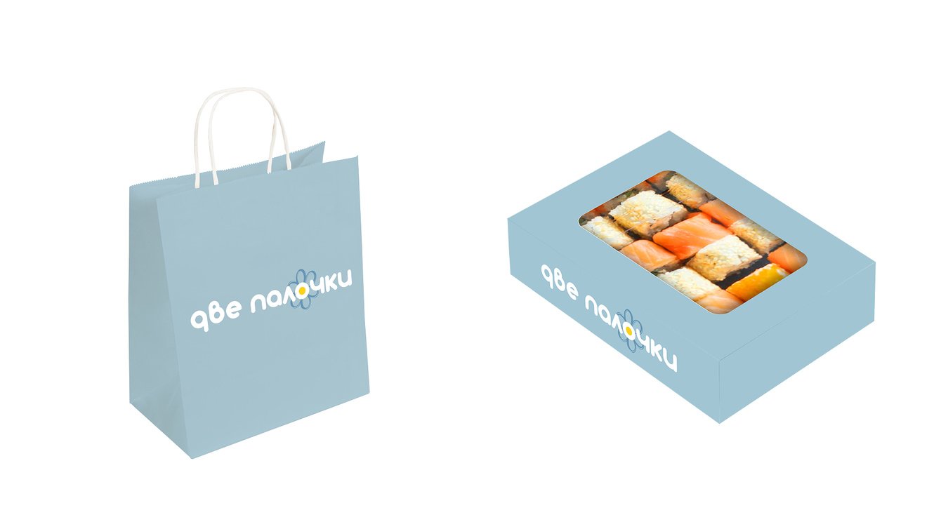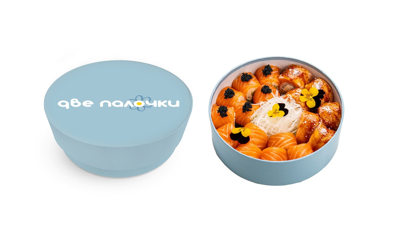 Логотип передает идею использования живых цветов в подаче роллов, суши и боксов, а округлый и нежный шрифт отражает вторую ключевую особенность — круглые инстаграмные боксы, в которых «Две Палочки» доставляют роллы.