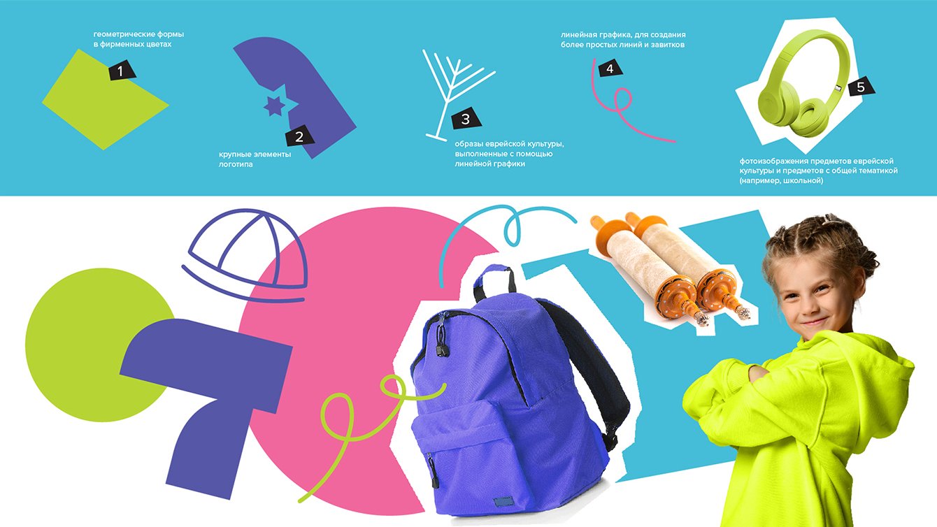 Фирменная графика, основанная на коллажной технике и аппликации, включает несколько уровней: геометрические формы, крупные элементы логотипа, образы еврейской культуры, линейную графику и фотоизображения иудаики. Динамичные композиции с разными фактурами и текстурами отражают внутреннюю насыщенность и многогранность проекта.