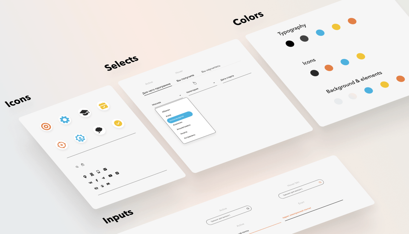 Заключительным этапом предпроектной подготовки стала разработка дизайн-концепции и определение направления визуального стиля. Опираясь на наш многолетний опыт, мы провели детальный анализ стилей конкурентов в России и мире, создали мудборд, позволяющий клиенту увидеть актуальные пути решения его задачи. В данном случае было принято решение пойти по пути минимализма, что идеально сочетается с предполагаемым большим объемом контента на платформе. Мы также учли, что данную площадку можно назвать своего рода «образовательным e-commerce», что позволило нам обратить внимание на лучшие практики как в образовательном секторе, так и в ведущих e-commerce продуктах.