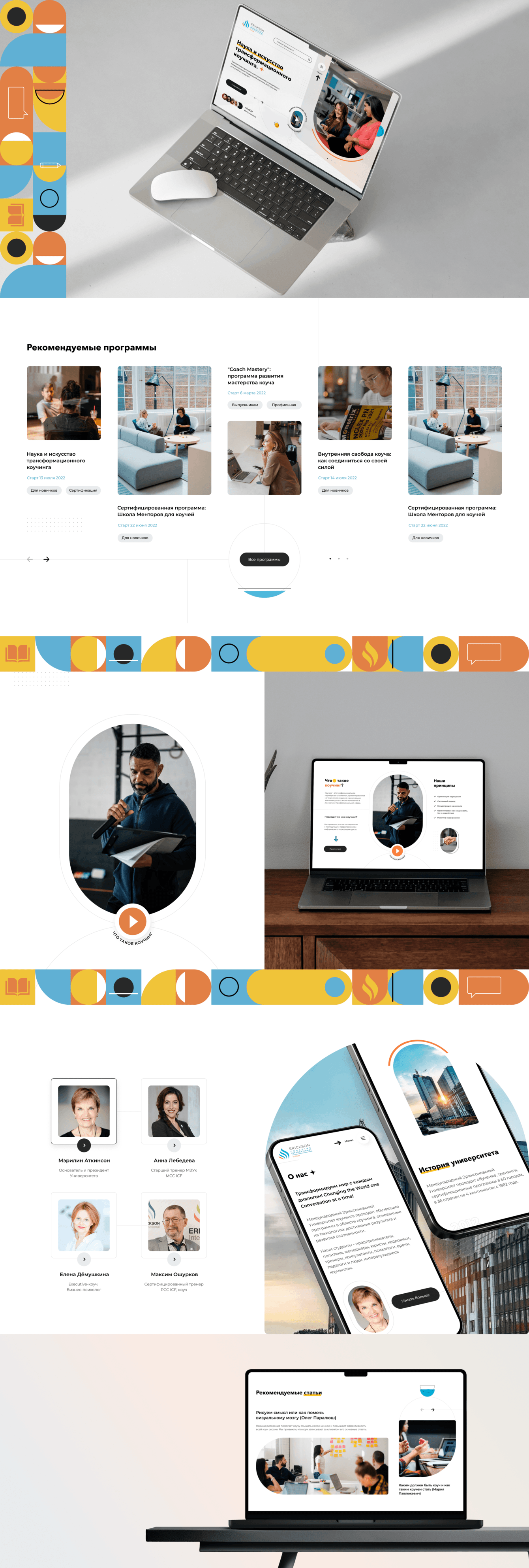 Поскольку параллельно с предпроектным исследованием наша команда брендинга уже разработала платформу бренда для университета, на момент старта дизайна сайта мы имели четкое представление об обновлённом фирменном стиле и визуальной коммуникации. Согласованные визуалы дизайн-концепции позволили нам объединить все элементы в единое целое, создавая продукт, отражающий суть и амбиции Университета коучинга.