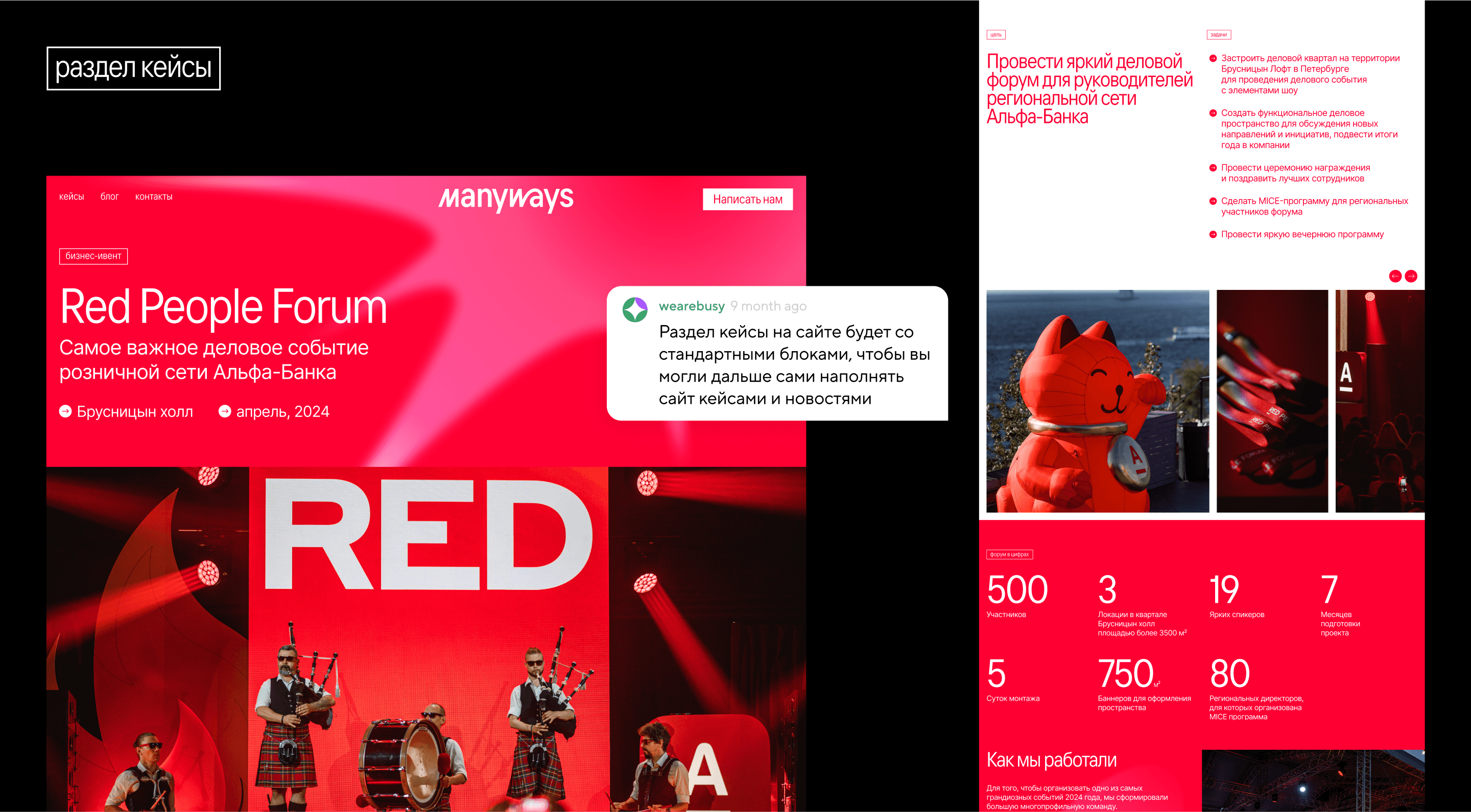 Сайт мы собирали на Tilda, чтобы Manyways могли дальше сами наполнять сайт кейсами и новостями. Для этого мы много работали со стандартными блоками на Тильде — например, шаблонная страница кейсов собрана на стандартных блоках с модификациями, которая выглядит как уникальный дизайн, но в тоже время удобна для наполнения не специалистом.