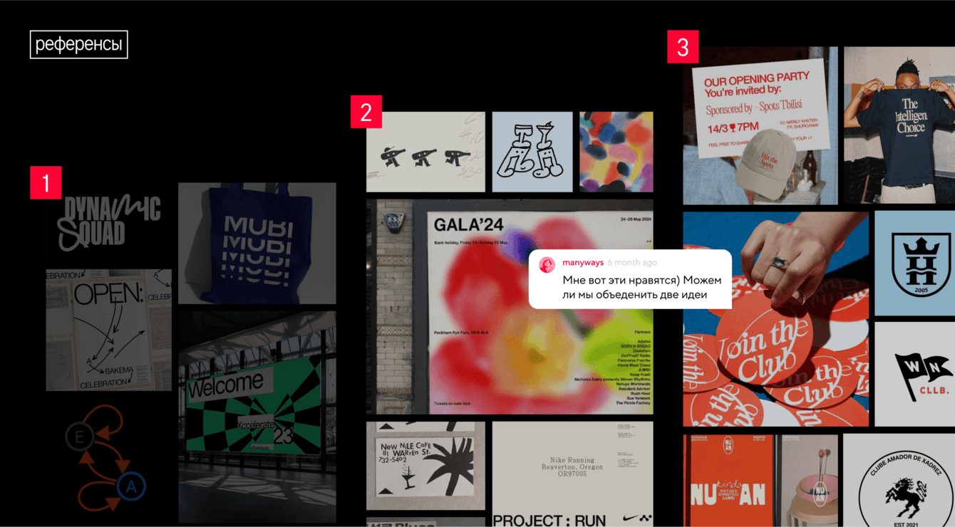 Мы собрали три направления, которые могли отразить важные для бренда атрибуты: внутренний огонь команды, поиск разных подходов, структурность в мире хаоса, любовь к ивентам и внутреннее сообщество — event lovers club.