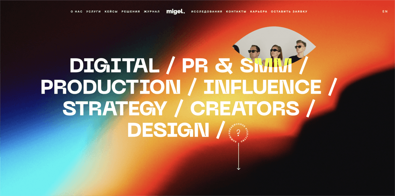 Мы спрятали наше командное фото на главной странице сайта за новым логотипом агентства. Так, двигая курсор в виде глаза по странице можно «подсмотреть» за изнанкой MIGEL AGENCY. Важен каждый человек, поскольку за любым крутым проектом, за решением любой задачи стоят люди.
