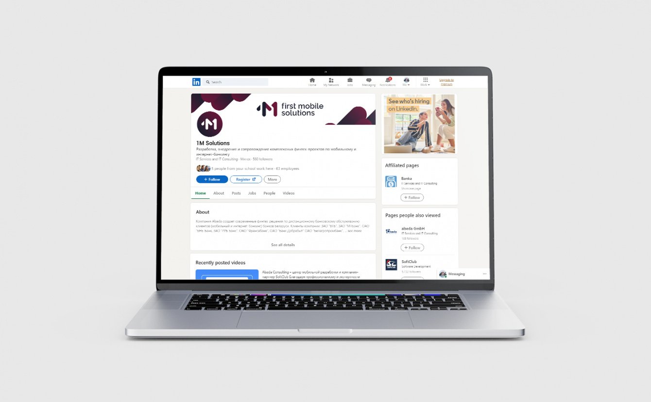 В ходе реализации проекта мы предложили более 7 вариантов нового имени бренда, проверенных по доступным источникам, а также на доступность регистрации домена. Финальным наименованием стало 1М Solutions (first mobile solutions) — лаконичное имя, хорошо работающее на узнаваемость. В нем отражено лидерство компании в отрасли разработки приложений.