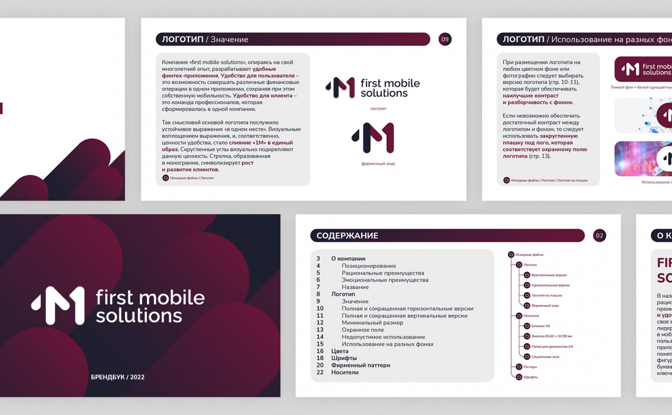 Приоритетной версией логотипа является горизонтальная с полным названием «first mobile solutions». Кроме этого, мы предусмотрели сокращенную горизонтальную версию логотипа. Данная версия будет использоваться в случаях, когда полное название «first mobile solutions» или «1М solutions» четко идентифицируется (присутствует полный логотип или упоминается полное название).