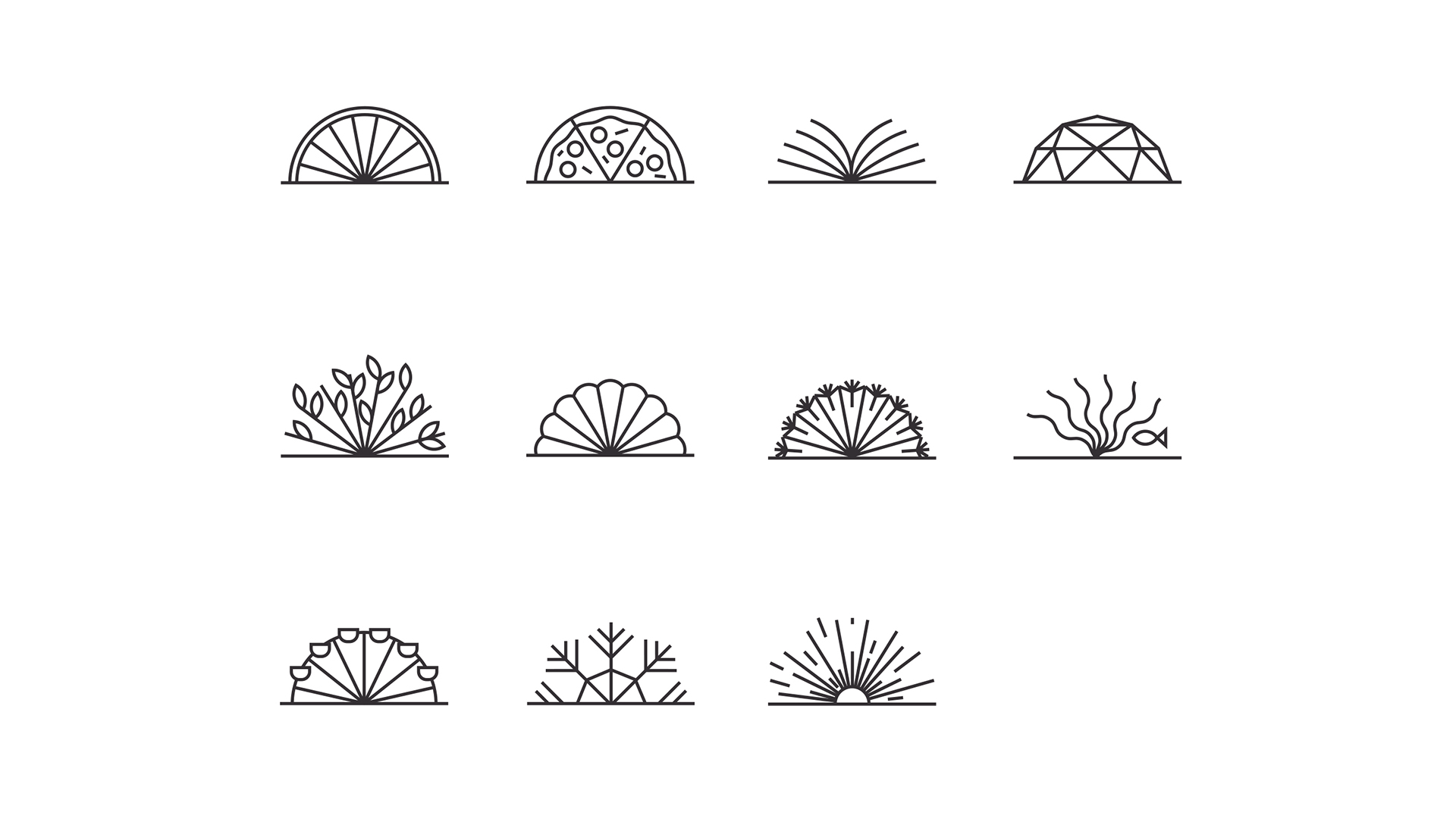 По аналогии с природой и культурой, логотип многолик, и принимает нужную форму в зависимости от контекста. Так возникает целая серия лучей природного и культурного происхождения, причем за композицией того или иного знака всегда угадывается прототип. Это столь актуальная живая айдентикс, которая еще лучше иллюстрирует метафору «Посольство природы». Используются в элементах навигации для обозначения аллей и прочего.