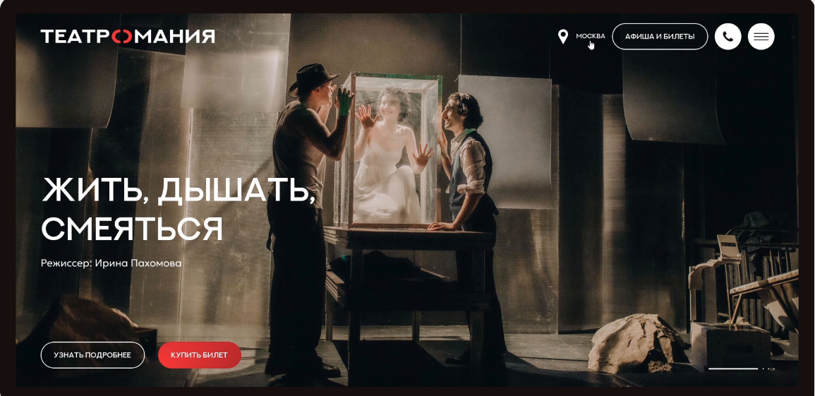 В результате пользователь не читает сайт, а «просматривает» его — как трейлер насыщенной театральной жизни.