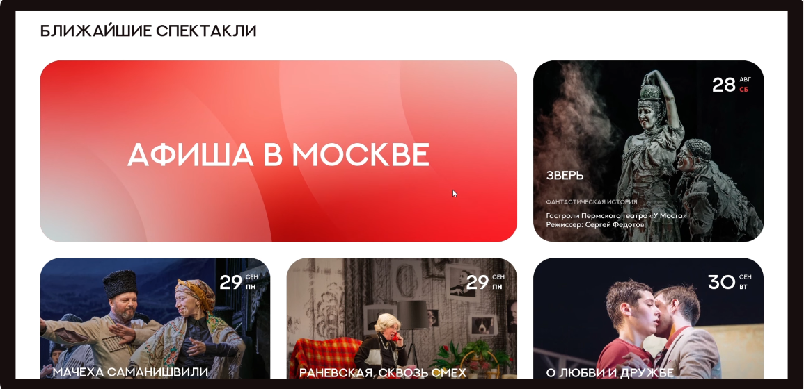 Главная задача — не просто информировать, а вовлекать: удерживать внимание, вызывать визуальный интерес и эмоциональный отклик на каждом экране. Повествование начинается с крупного изображения, работающего как кинокадр, затем переходит к динамичным карточкам спектаклей, где композиция и свет отсылают к кинопостерам. Расположение блоков следует монтажному принципу — от крупного плана к среднему, от эмоции к факту.