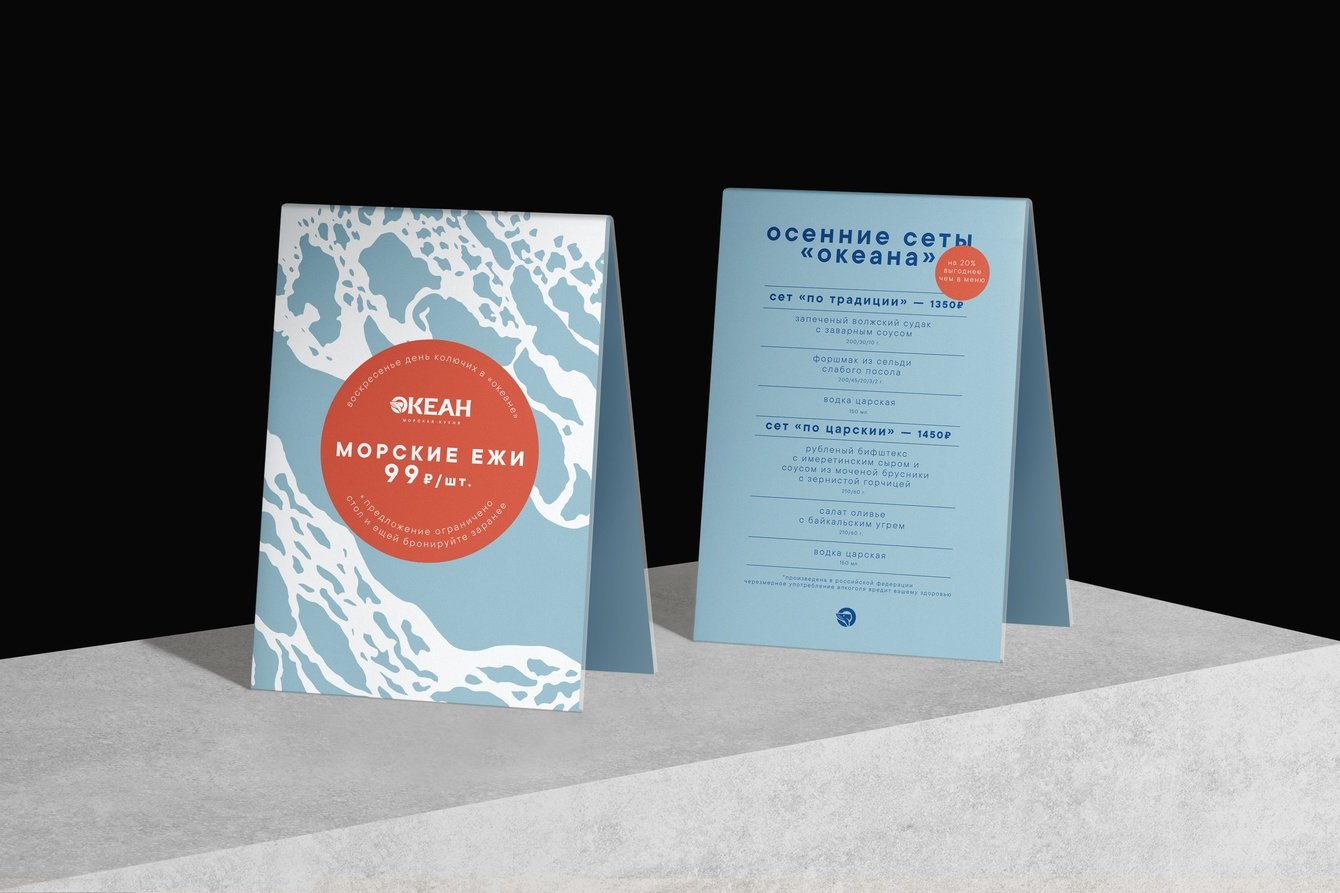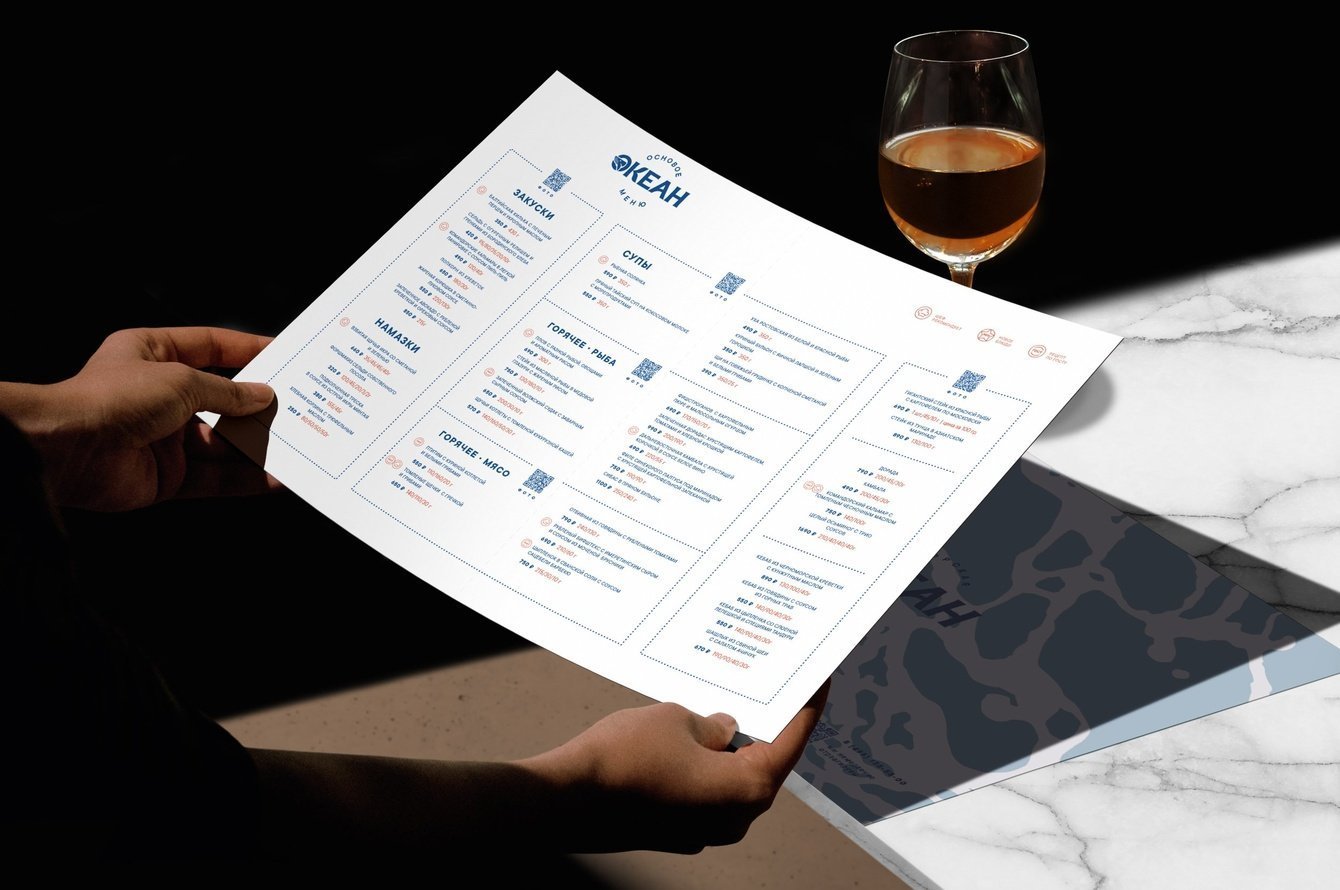 Океан - это ресторан гастрономического изобилия морских глубин. В основе меню – современные авторские блюда из рыбы и морепродуктов, привезенных из разных уголков России. В меню в стиле smart comfort food шеф демонстрирует актуальный взгляд на морскую тему, оставляя при этом место отголоскам вкусов, любимых с детства. В соответствии с планами развития компании и в честь открытия третьего ресторана агентство GreenMars провело визуальный ребрендинг сети ресторанов морской кухни Океан.
