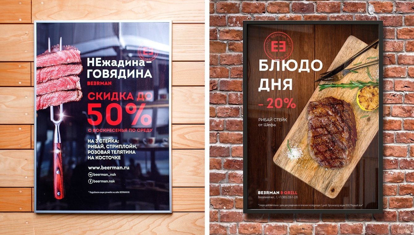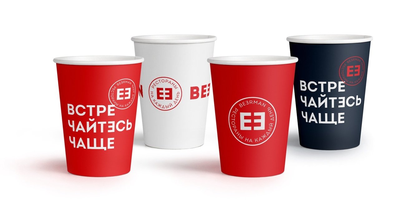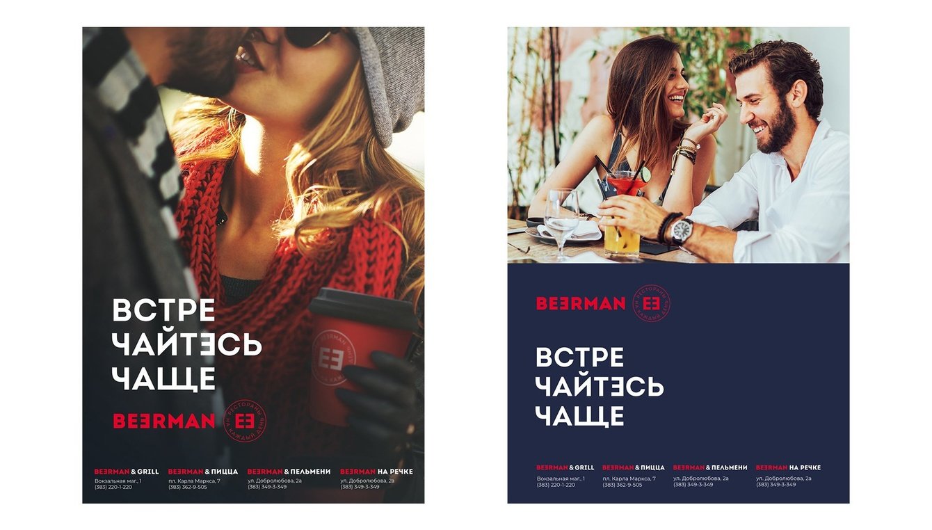 Мы искали то, что объединяет рестораны сети, и поняли, что это атмосфера встреч и общения за вкусной едой, какой бы она не была – гриль, пицца или пельмени. Айдентика строится на слогане «Встречайтесь-общайтесь» и встрече двух букв Е.