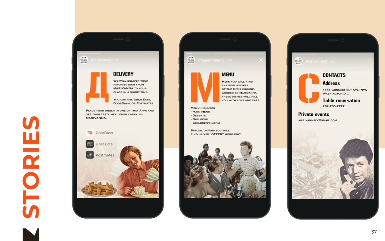 Сделать стратегию ребрендинг аккаунта к открытию ресторана после закрытия франшизы; Создать креативный контент план;