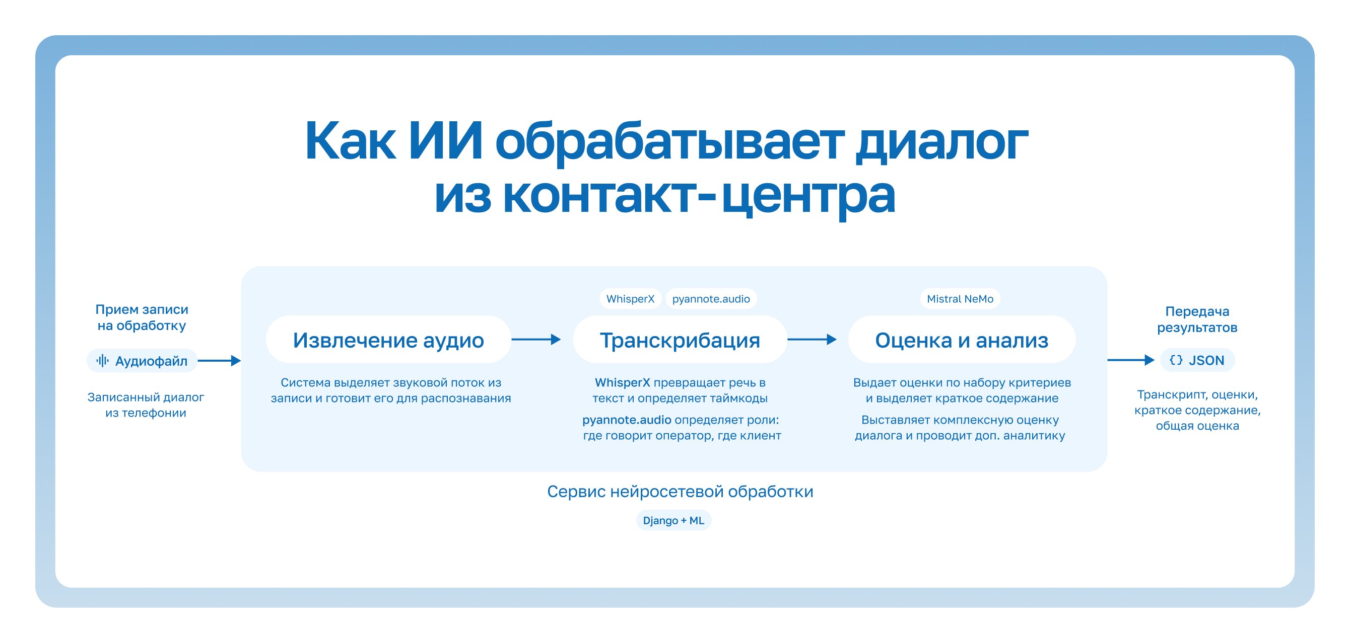 В основе системы — связка из трёх моделей, каждая из которых отвечает за свой этап анализа звонка.