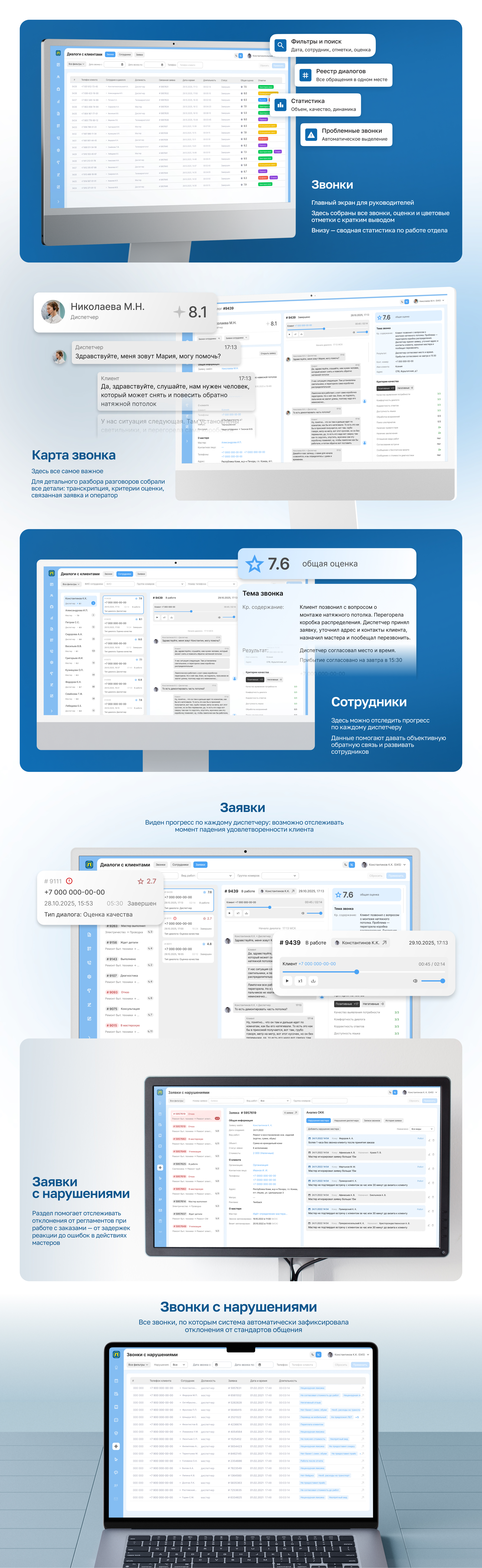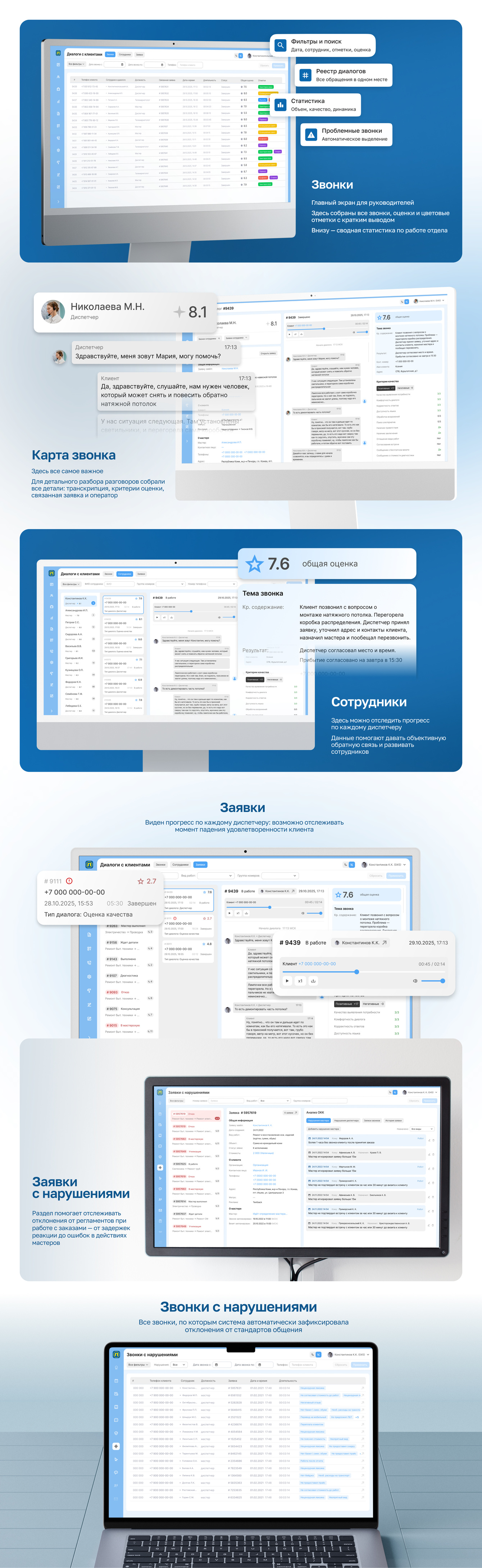 Решение собирает записи звонков из телефонии, преобразует речь в текст, анализирует диалоги и формирует отчётность в интерактивных дашбордах для руководителей. А ещё — фиксирует нарушения и сопоставляет их с правилами работы по заявке.