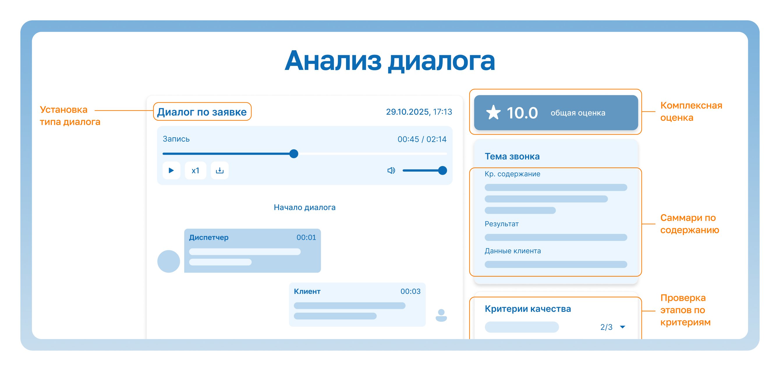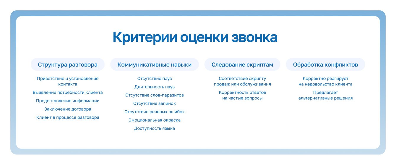 Собрали группы, а для каждой группы и типу разговора — свой набор критериев. Определили, что нужно фиксировать: